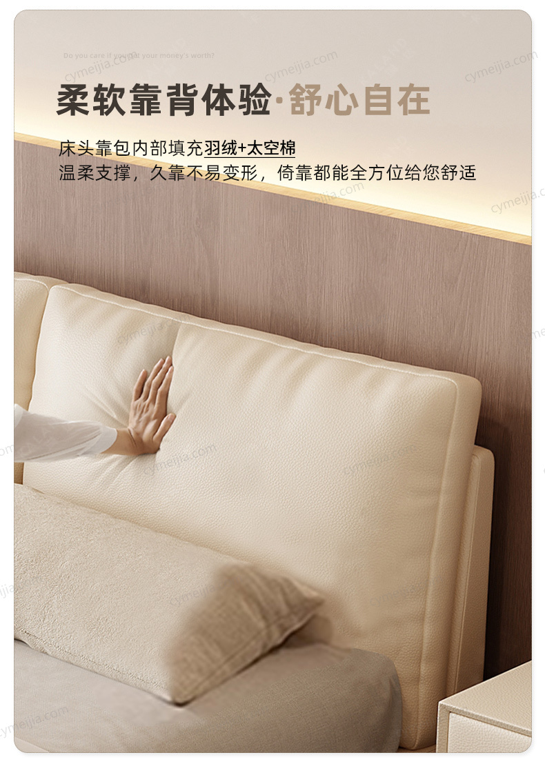 | 产品材质 : | 优质皮艺+羽绒+高密度海绵+俄罗斯落叶松实木框架+10公分松木排骨架 |