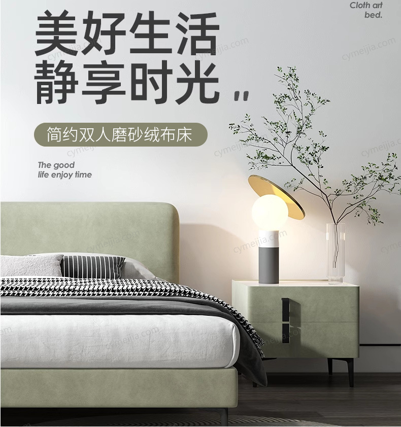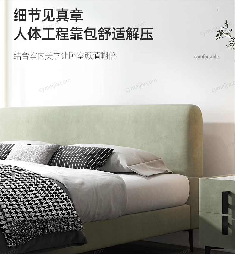 | 产品材质 : | 磨砂绒布+实木框架+高密度海绵+10公分松木排骨架 |