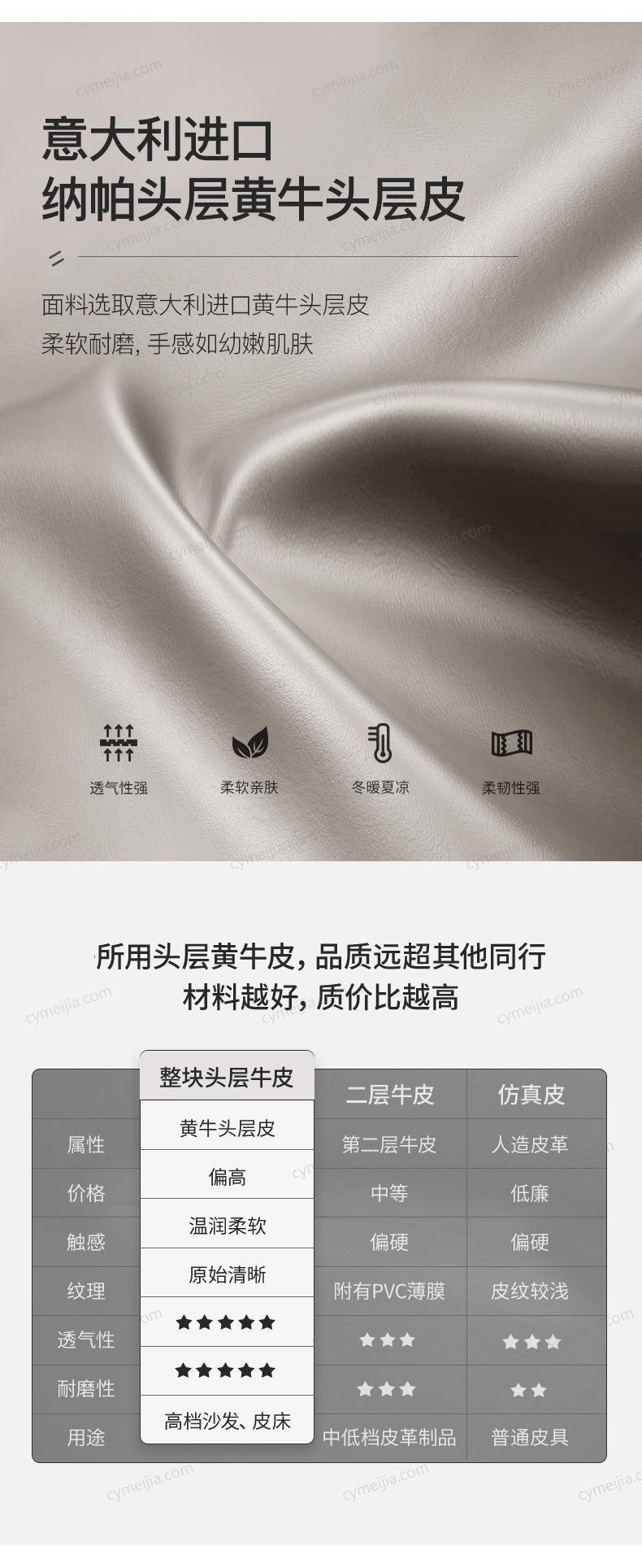 | 产品材质 : | 接触面进口头层黄牛皮+高密度海绵+俄罗斯落叶松实木框架+碳素钢脚+10公分松木排骨架 |