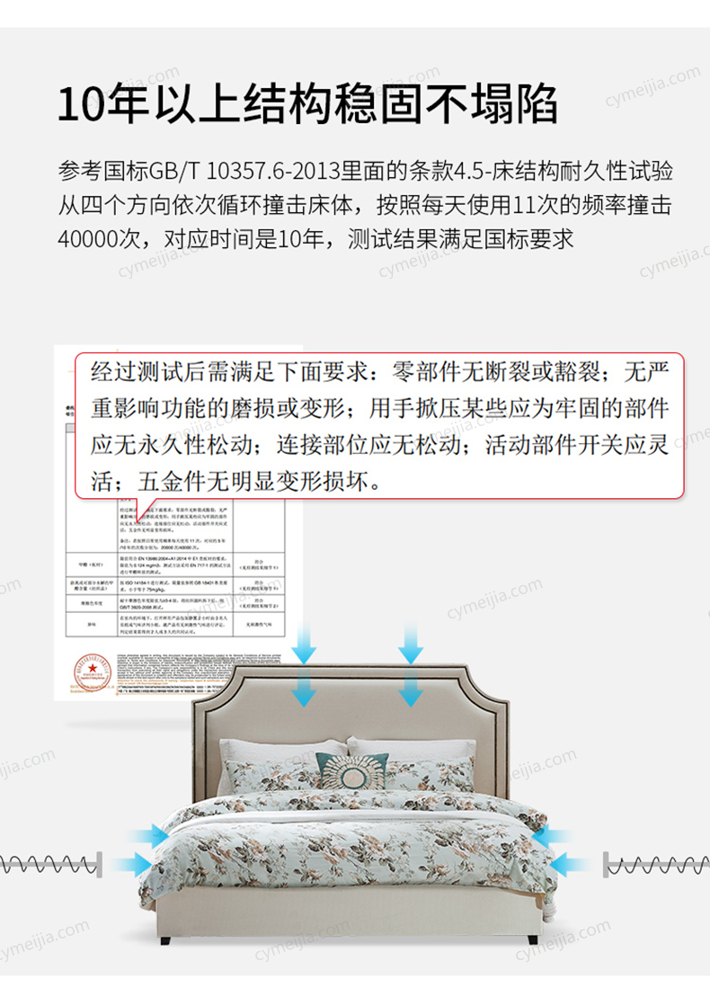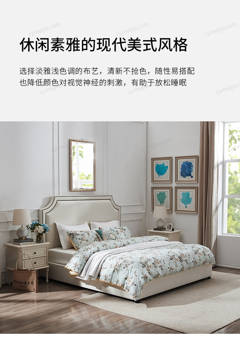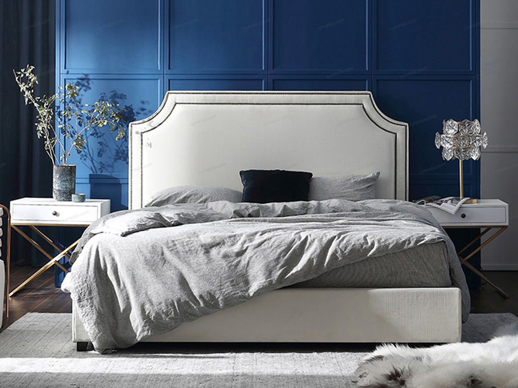 | 产品材质 : | 进口环保高密度板+实木+棉麻亲肤面料+高弹海绵+优质防氧化铆钉+10公分松木排骨架 |