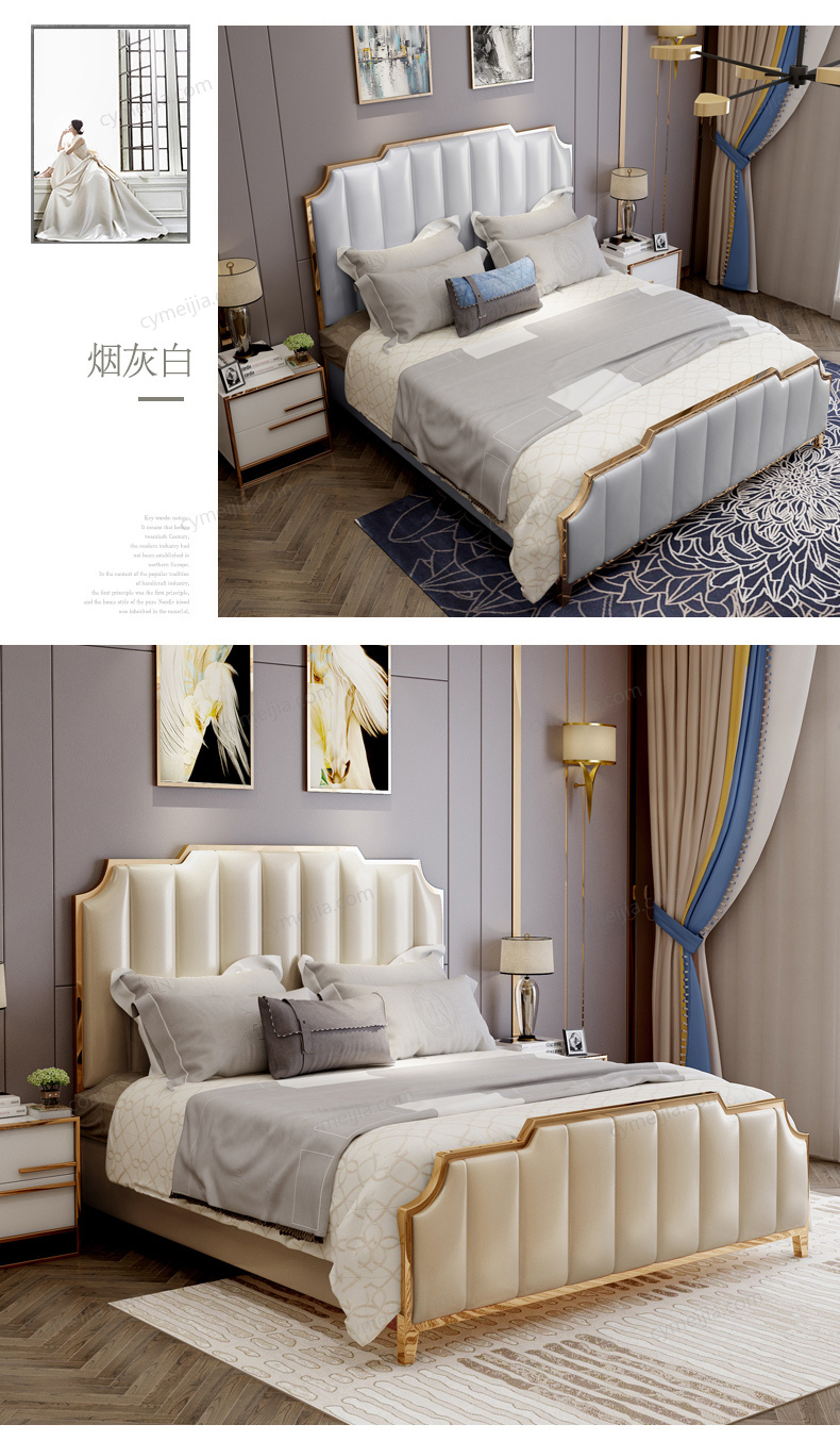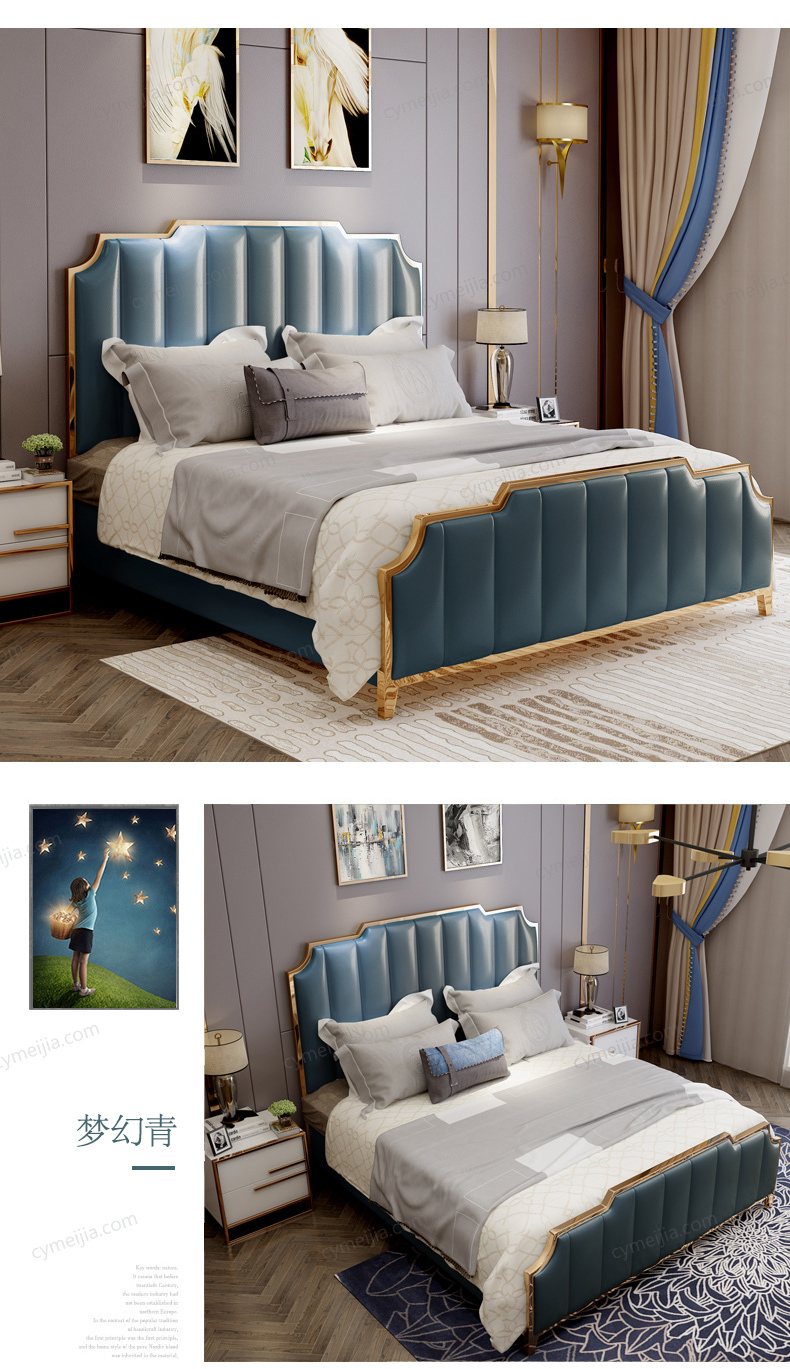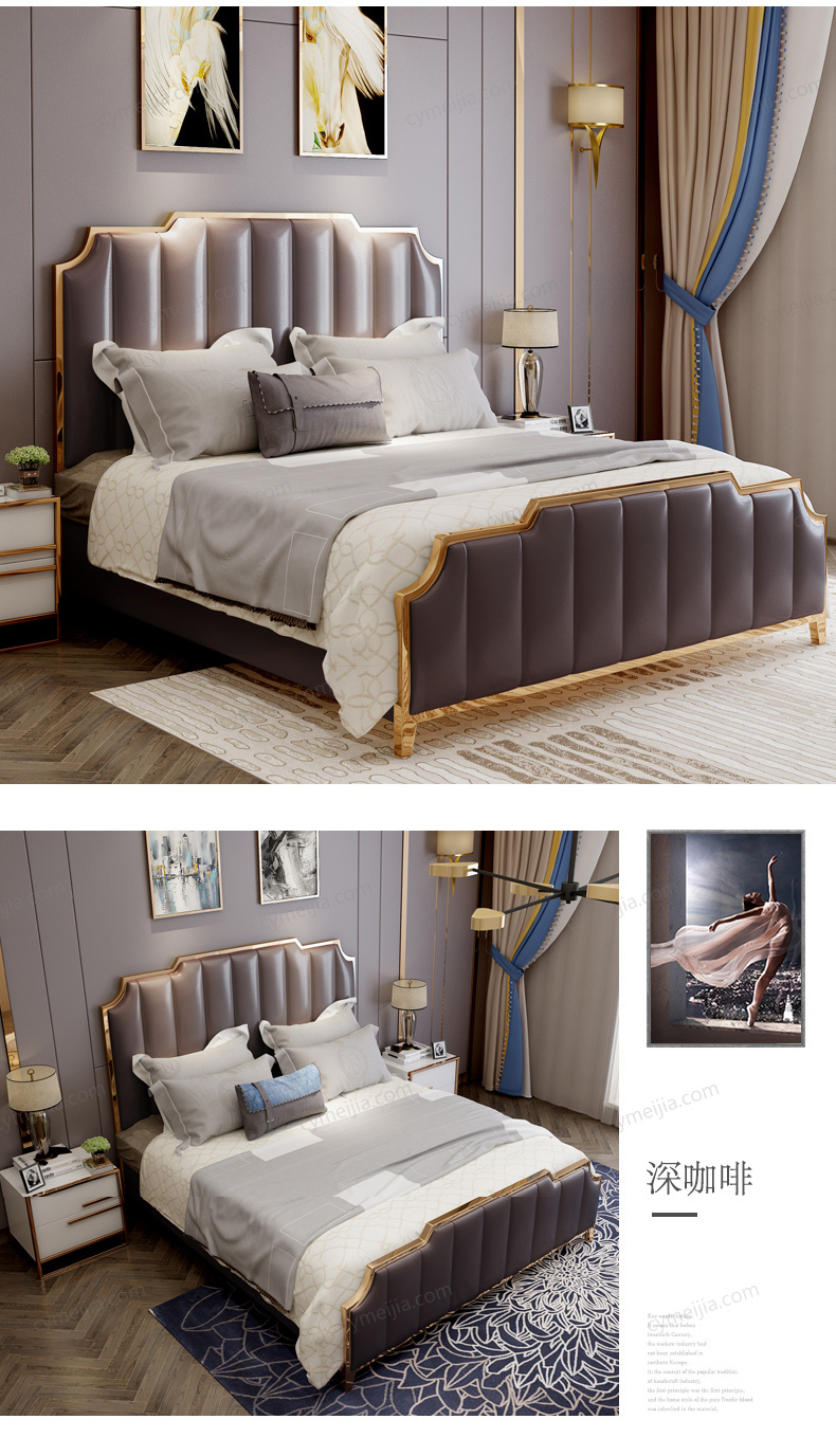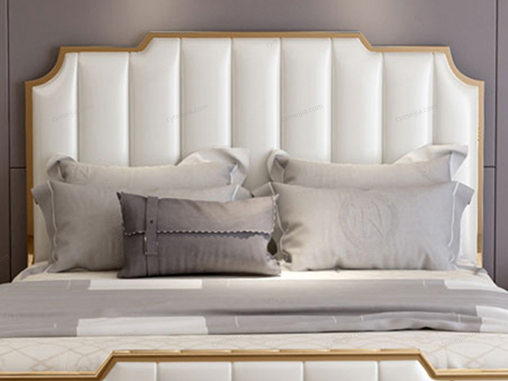 | 产品材质 : | 优质夹板+实木+高弹海棉+优质仿真皮+不锈钢拉丝封釉镀钛金+10公分松木排骨架 |