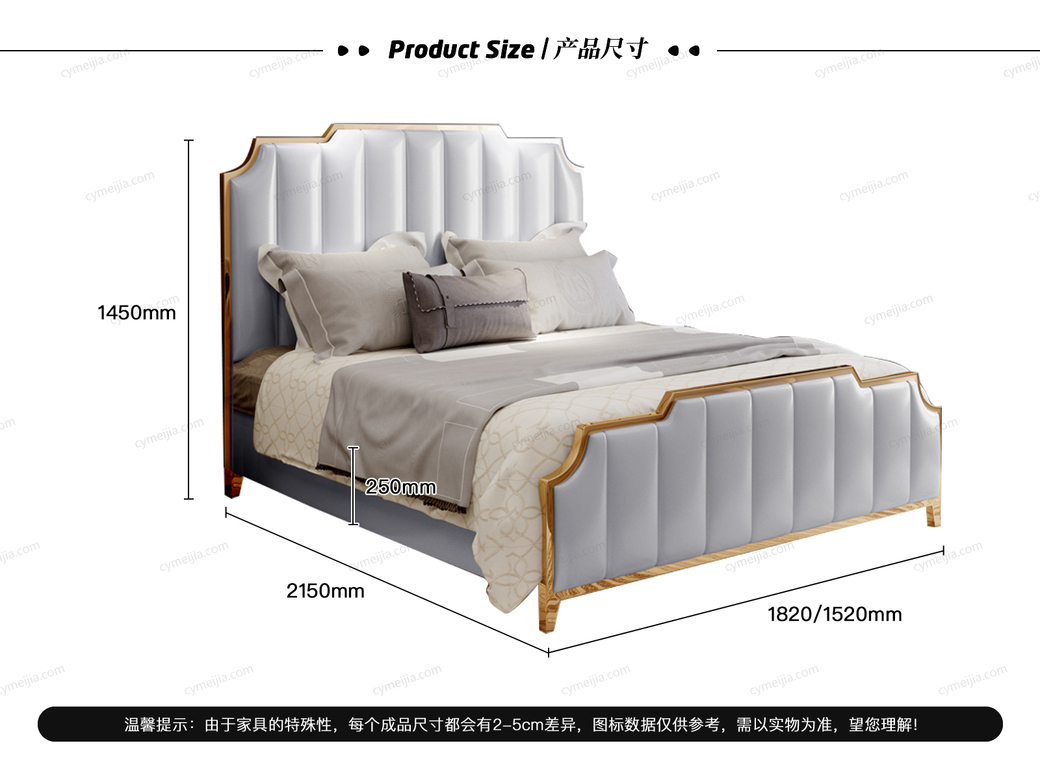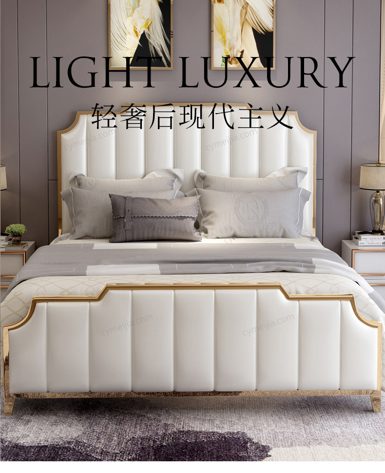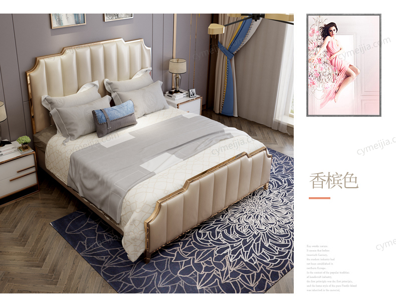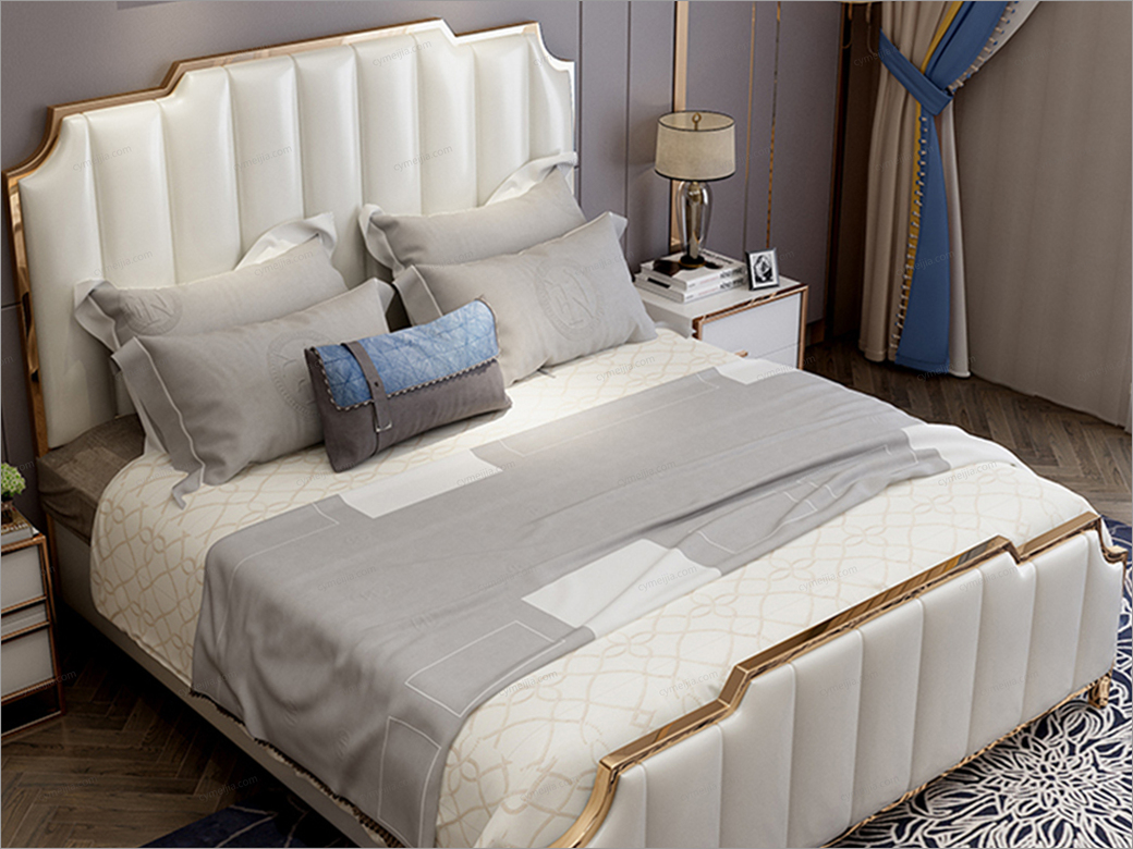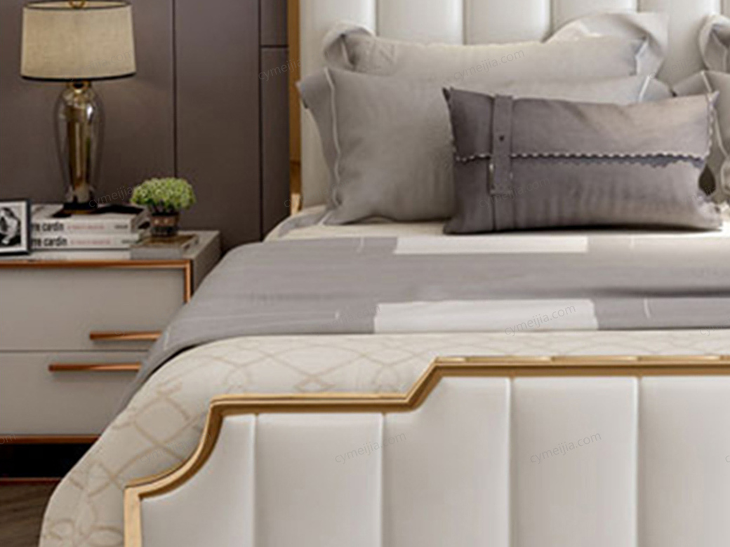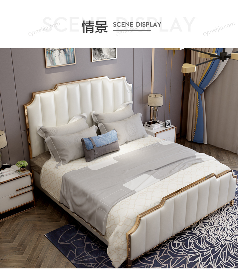 | 产品材质 : | 优质夹板+实木+高弹海棉+优质仿真皮+不锈钢拉丝封釉镀钛金+10公分松木排骨架 |