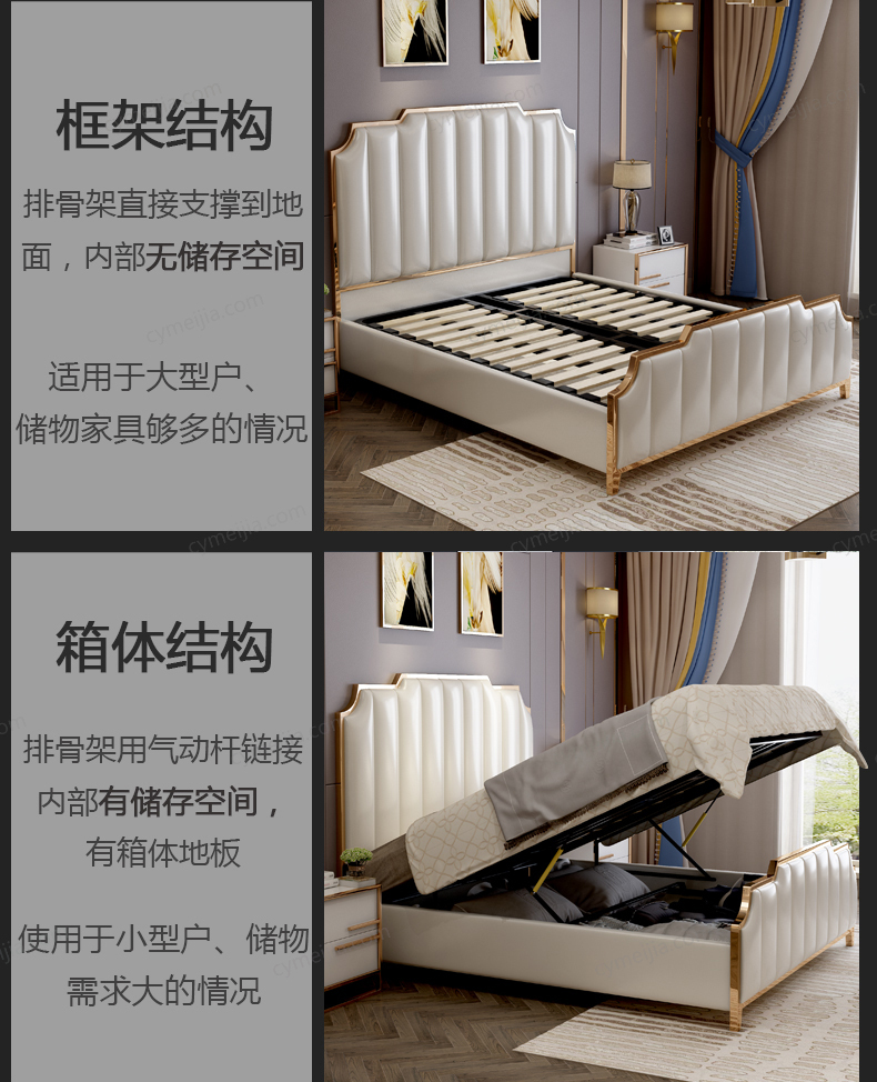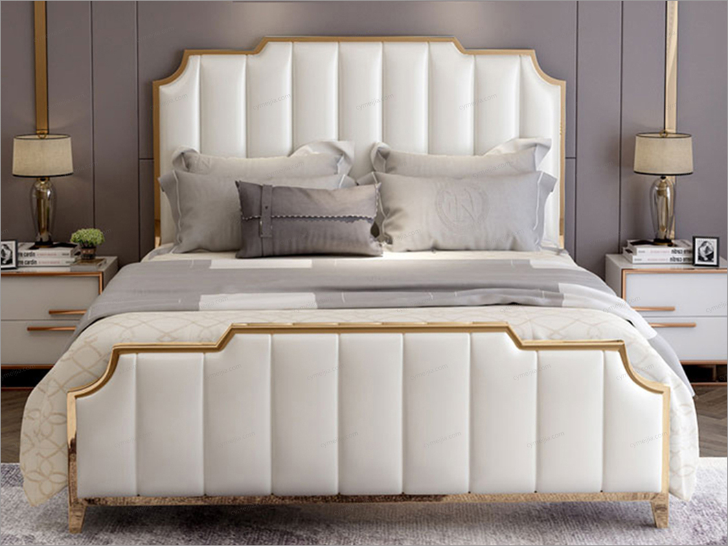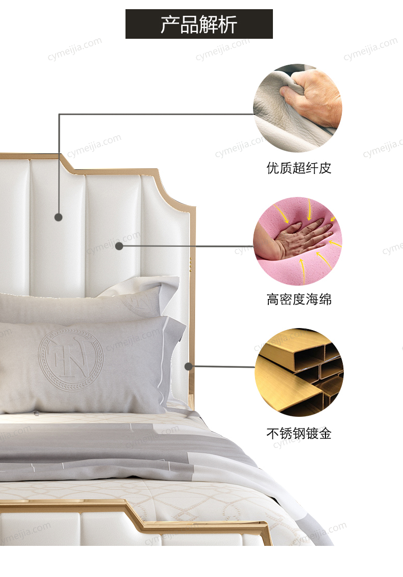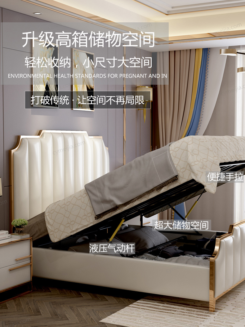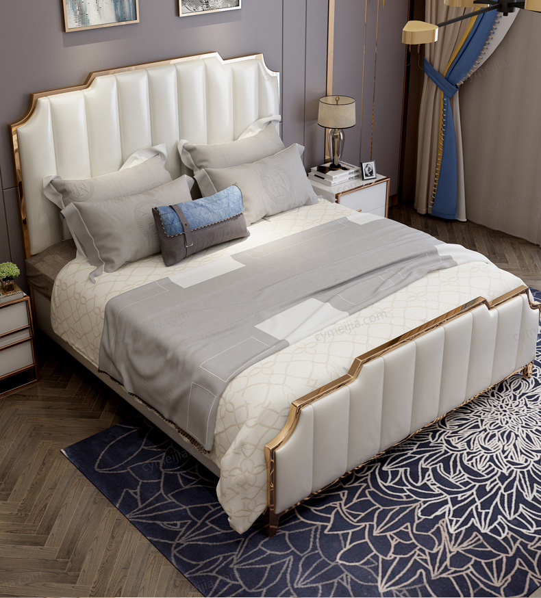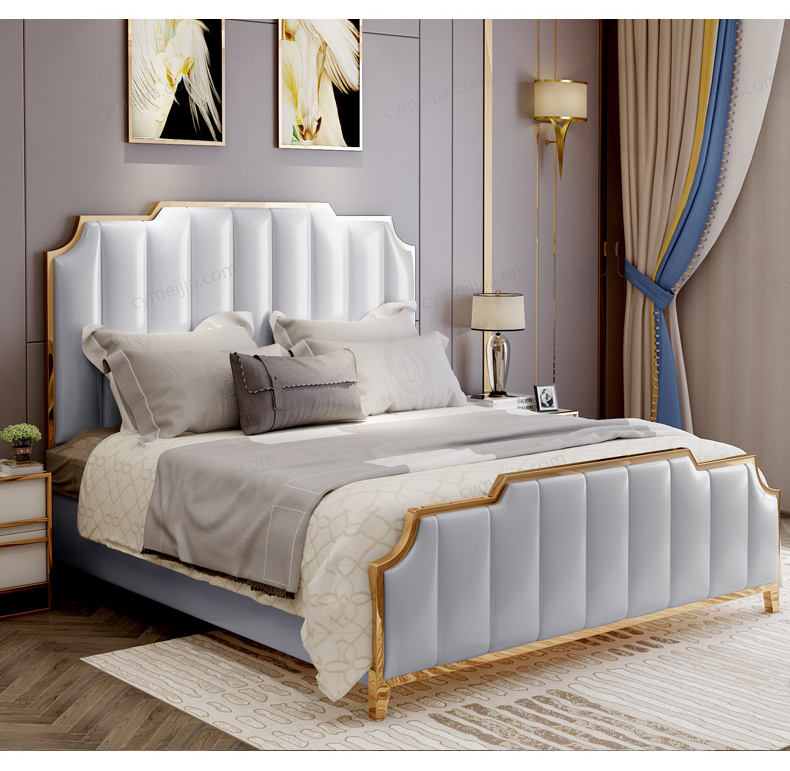 | 产品材质 : | 优质夹板+实木+高弹海棉+优质仿真皮+不锈钢拉丝封釉镀钛金+10公分松木排骨架 |