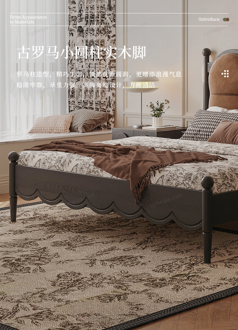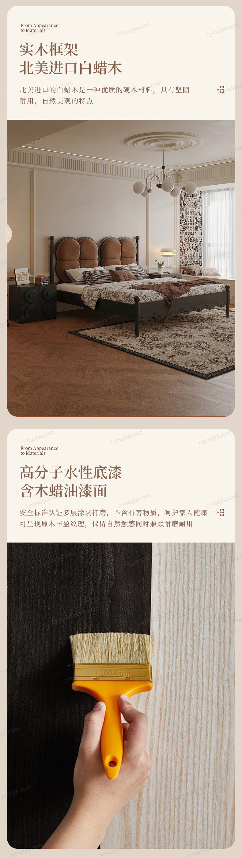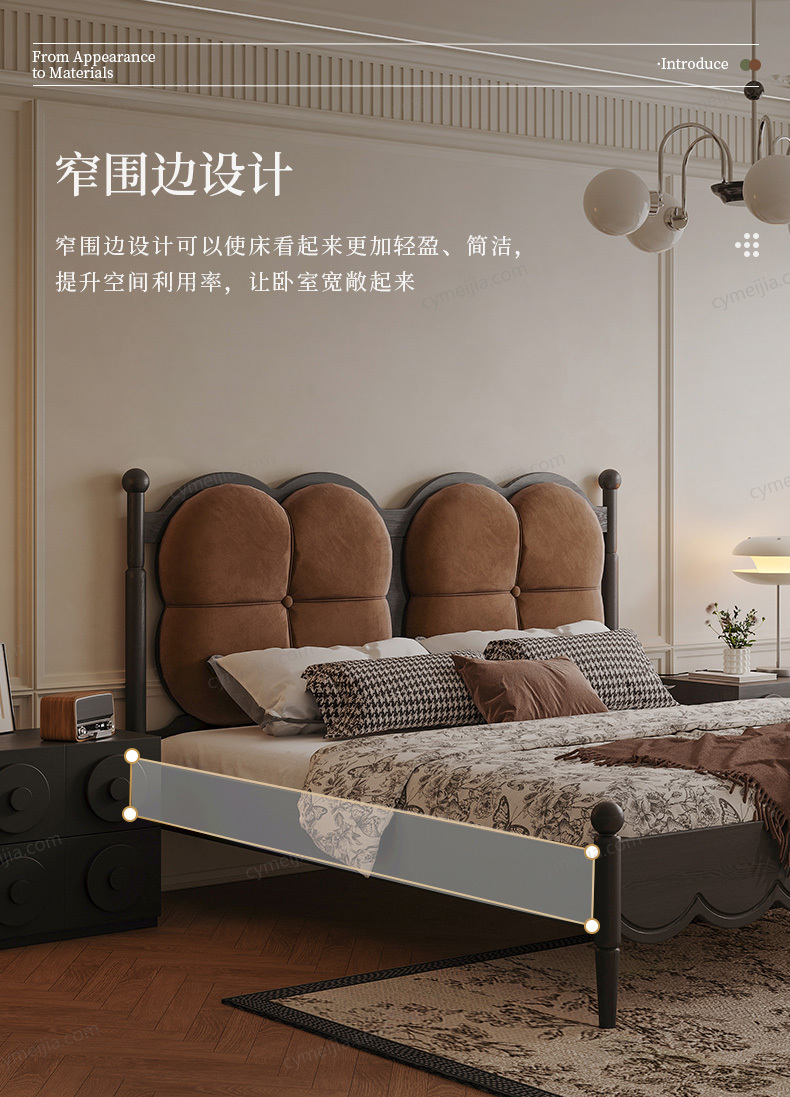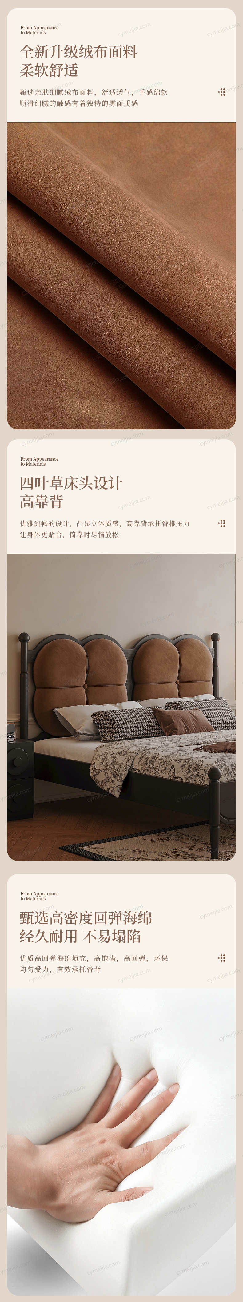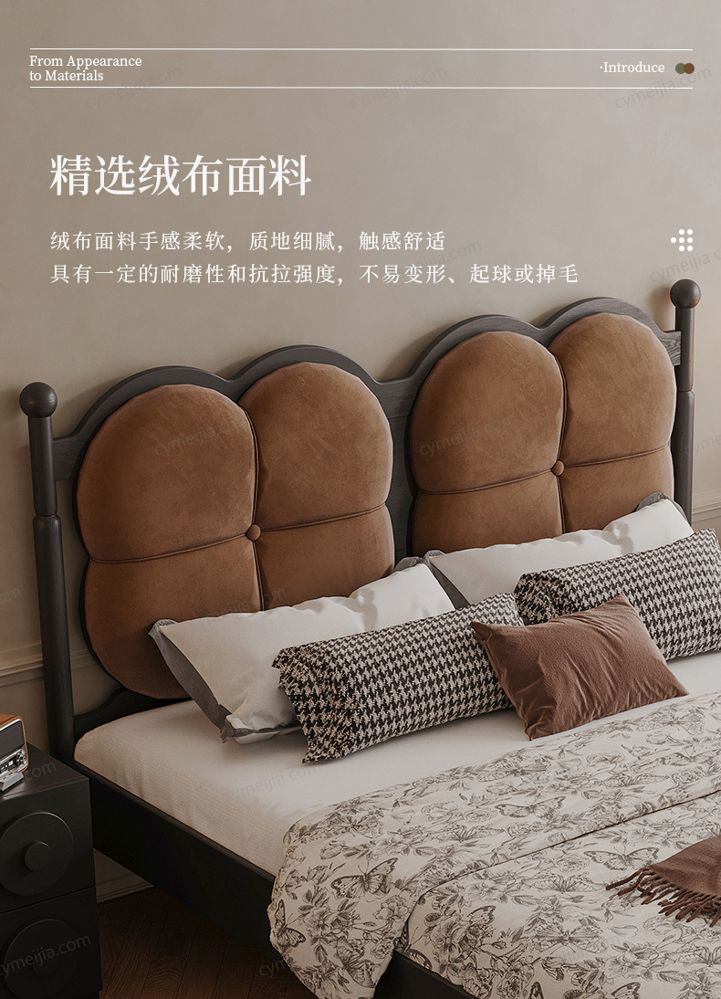 | 产品材质 : | 北美进口白蜡木框架+绒布+实木多层板+高密度海绵+松木床板条 |