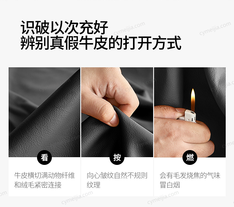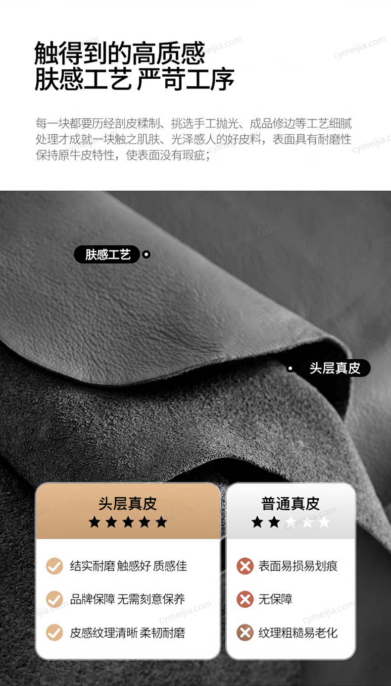◕ 真皮均为优质进口头层黄牛皮(绝不使用生态皮),源自佛山三大皮行之一瑞新皮行,甄选优质皮胚,有韧性弹性,手感柔软。