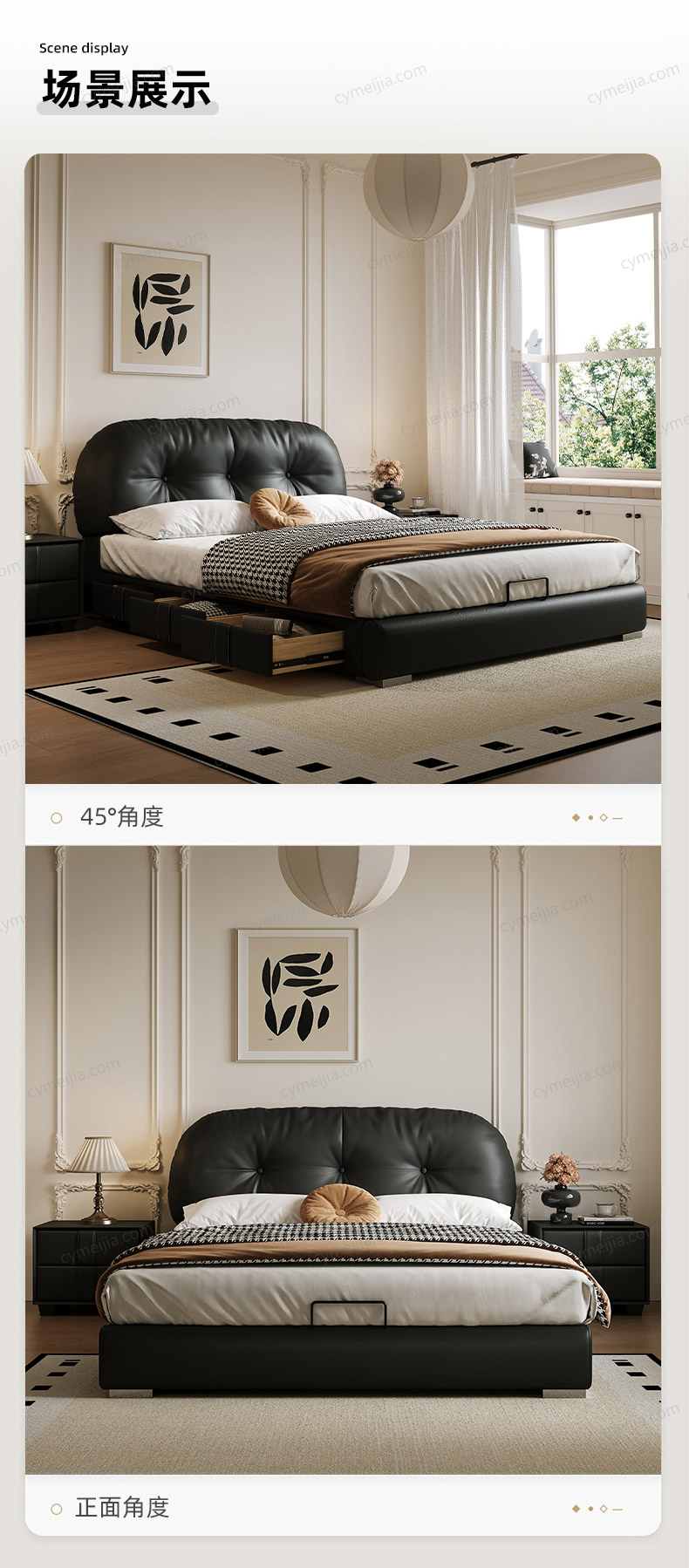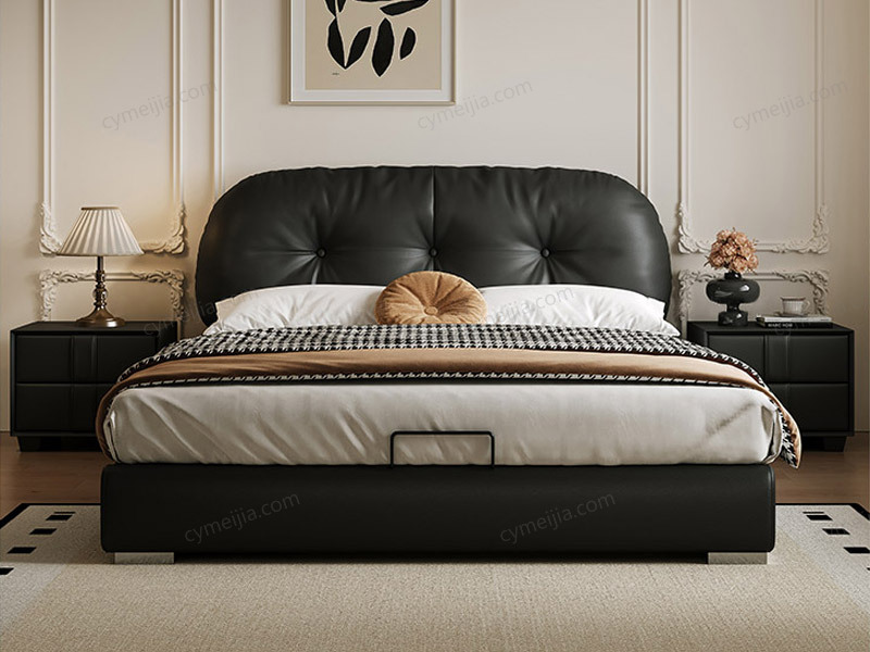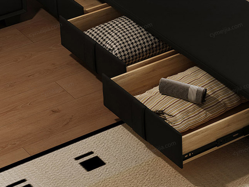 | 产品材质 : | 仿真皮+高密度海绵+实木抽屉+俄罗斯落叶松实木框架+五金脚+10公分松木排骨架 |