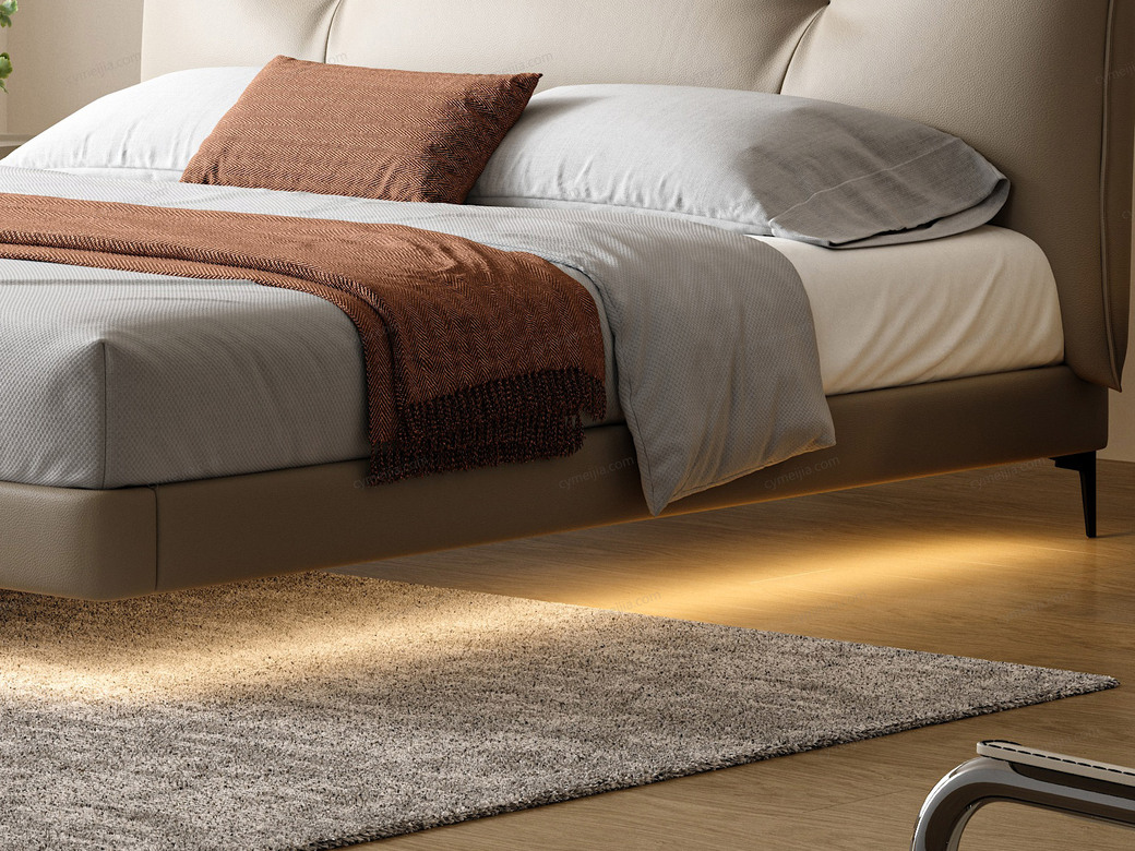 | 产品材质 : | 接触面进口头层黄牛皮+高密度海绵+俄罗斯落叶实木框架+灯带+十公分松木排骨架 |