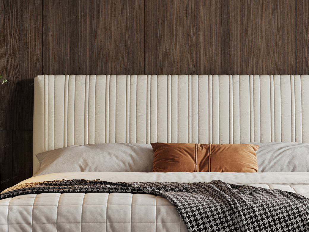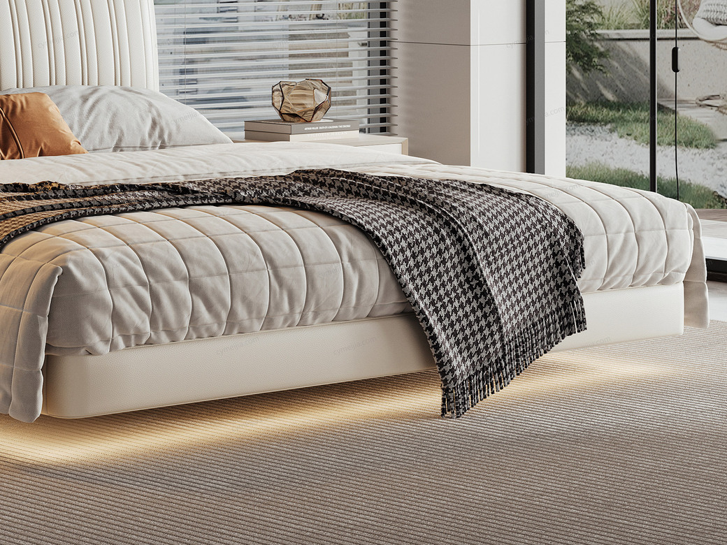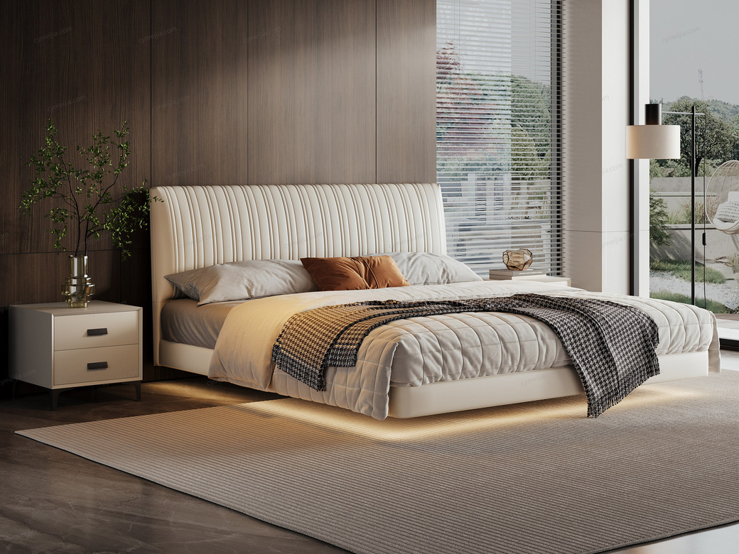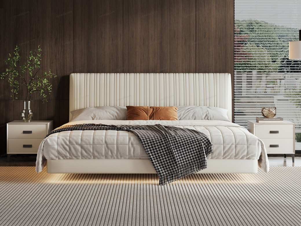 ☀ 床头竖纹立体设计富有层次,搭配底部悬浮灯带,夜间点亮时营造科技感与氛围感,既是卧室家具也是视觉艺术装置,为空间注入高级时尚感。