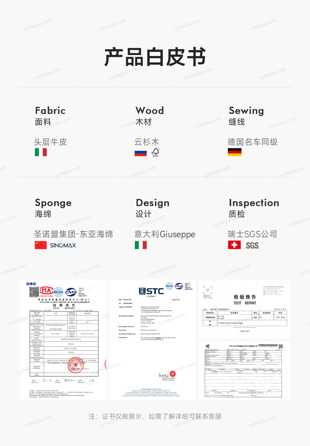 | 产品材质 : | 接触面头层牛皮+非接触面仿真皮+俄罗斯云杉木框架+东亚海绵 |
