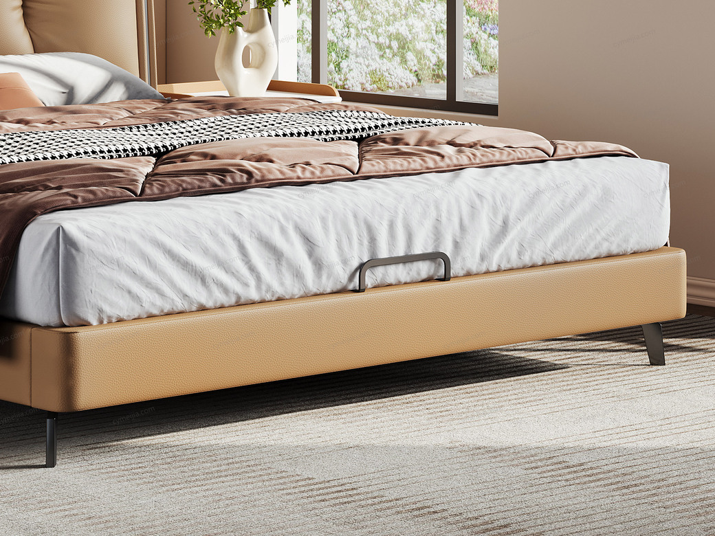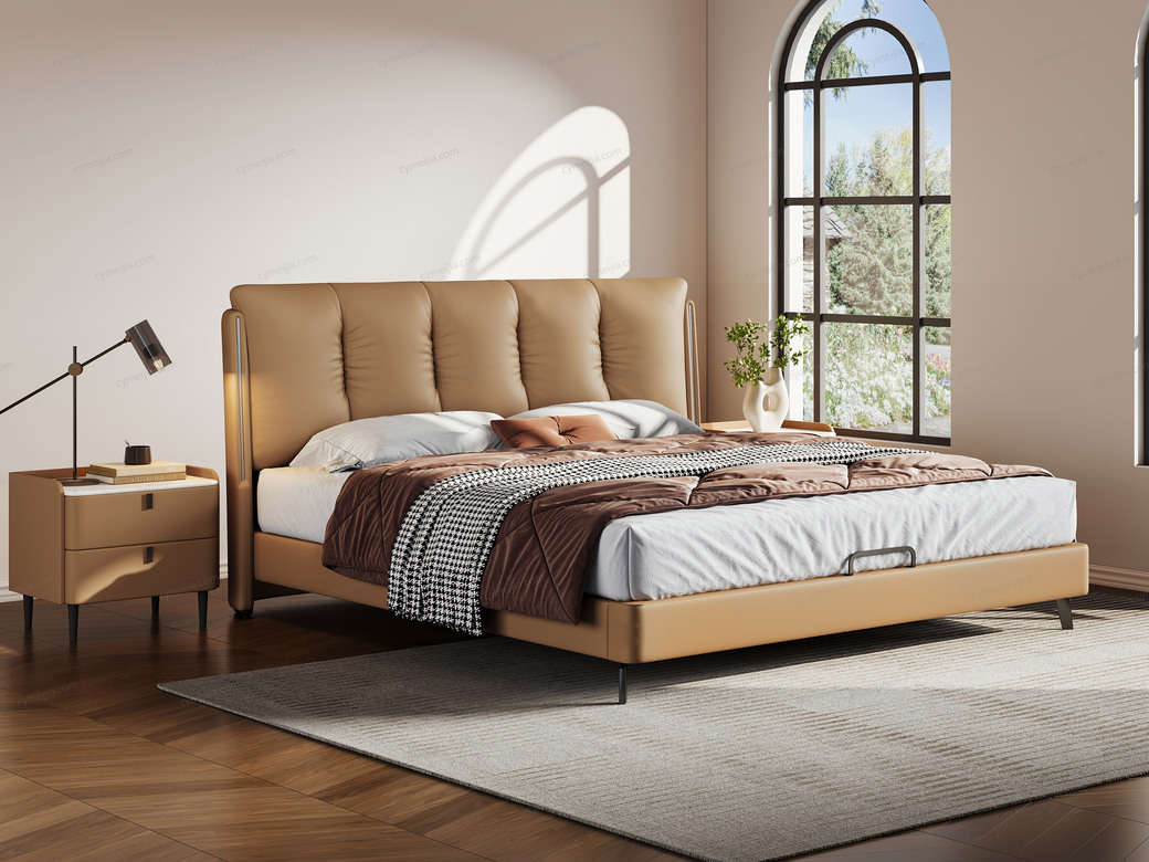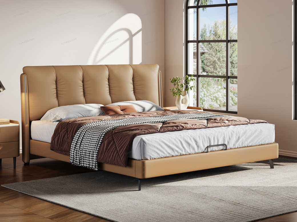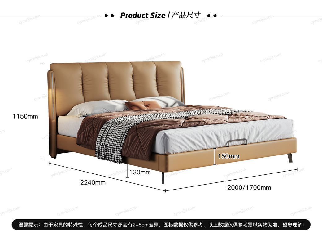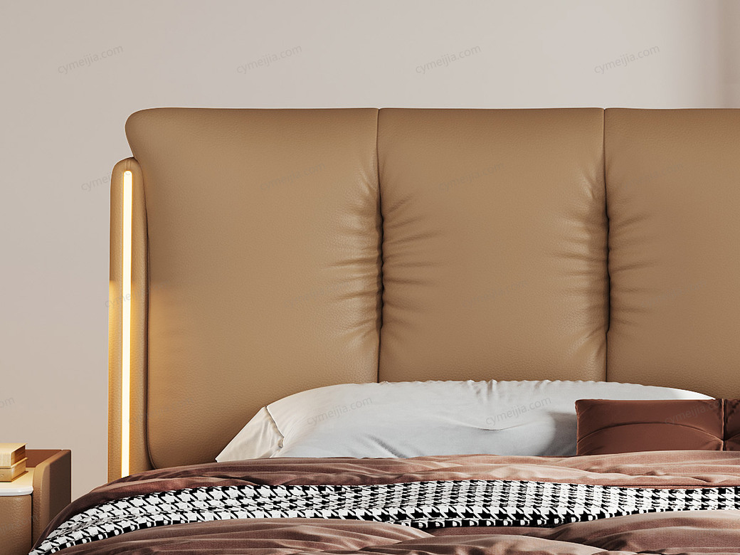 | 产品材质 : | 接触面进口头层黄牛皮+鹅绒靠包+高密度海绵+俄罗斯落叶松实木框架+床头两侧感应灯带 |