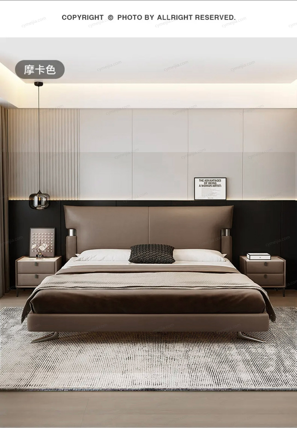 ☀ 床头两侧的金属装饰元素与独特的“外八字”床脚,提升整体设计的精致度与协调感。