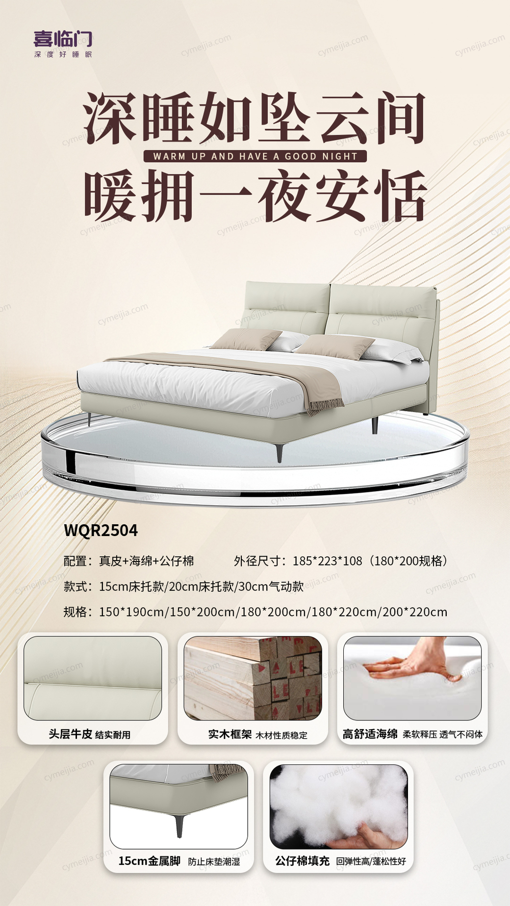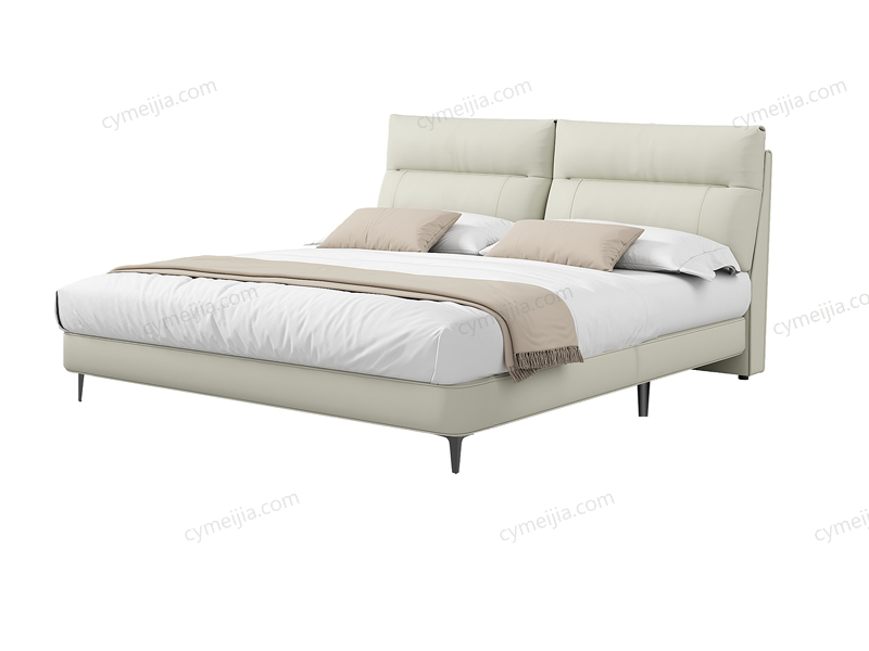 | 产品材质 : | 接触面头层真皮+落叶松实木框架+高密度回弹海绵+15公分金属脚+静音床板 |