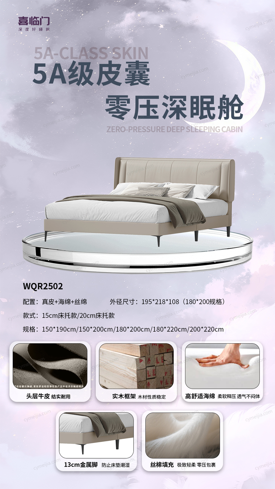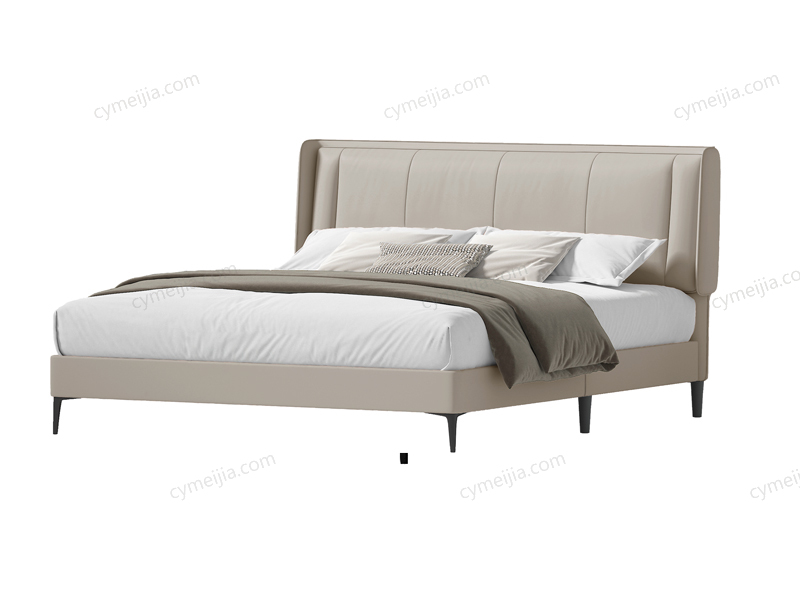 | 产品材质 : | 接触面头层真皮+落叶松实木框架+高密度回弹海绵+13公分金属脚+静音床板 |