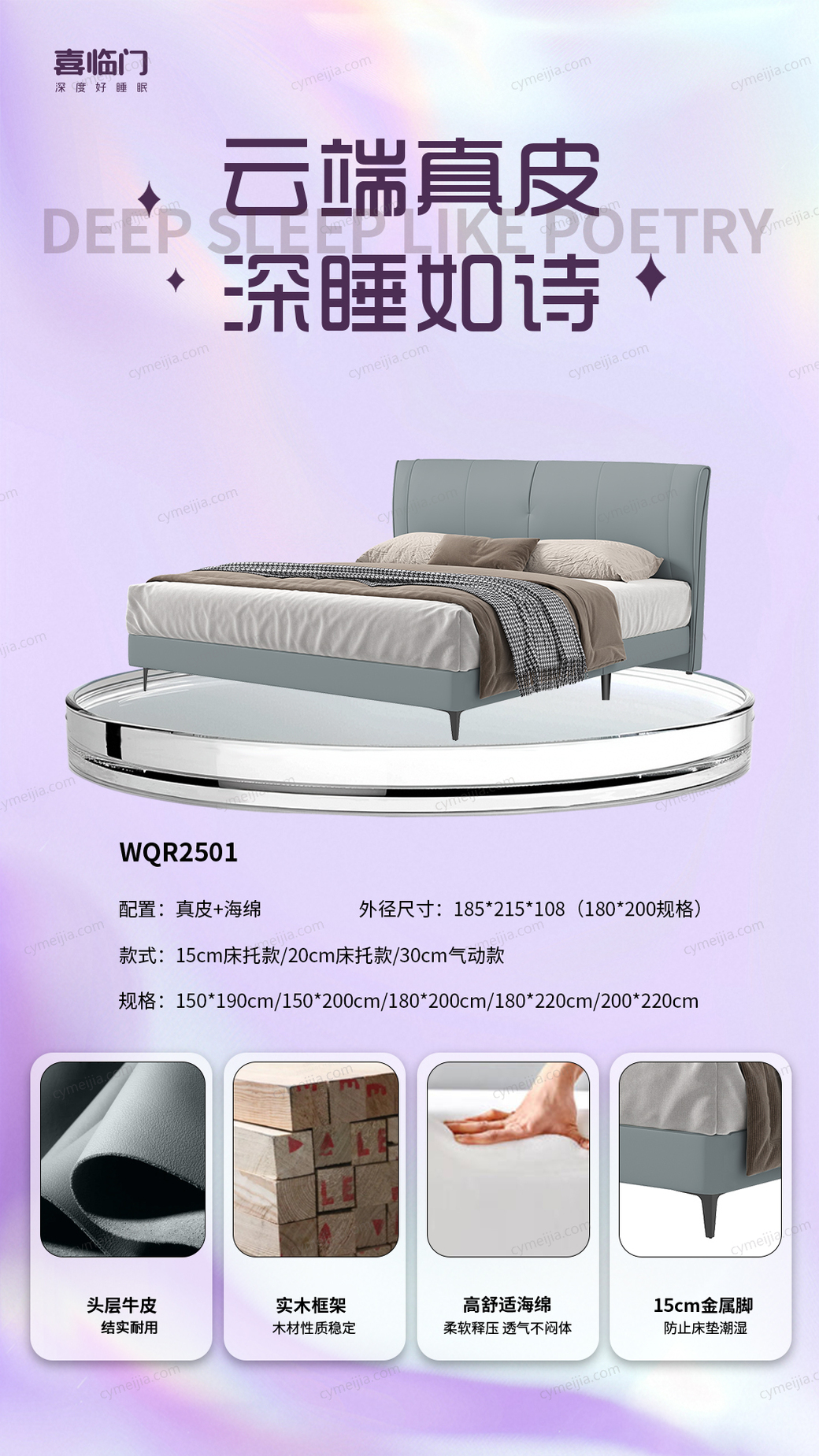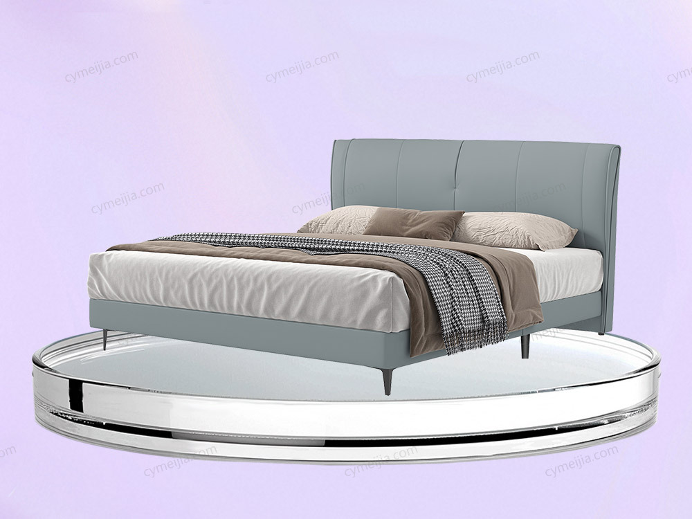 | 产品材质 : | 接触面头层压纹真皮+落叶松实木框架+高密度回弹海绵+15公分金属脚+静音床板 |