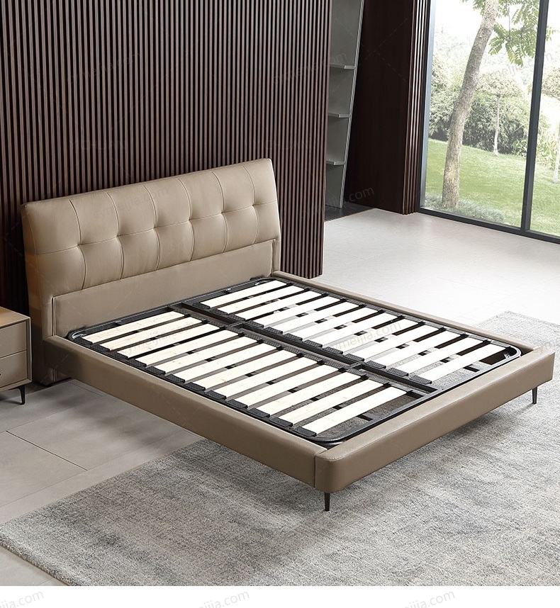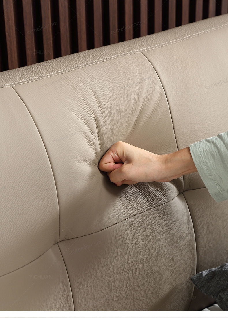 | 产品材质 : | 接触面头层牛皮+实木床边+黑色角码+10公分松木排骨架 |