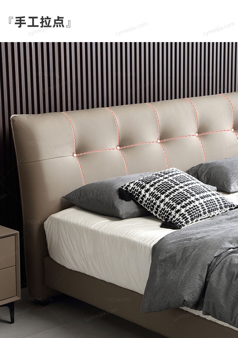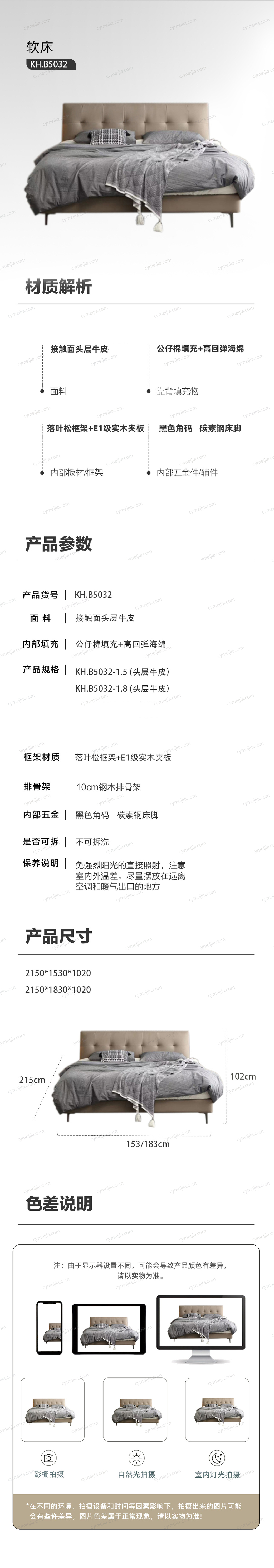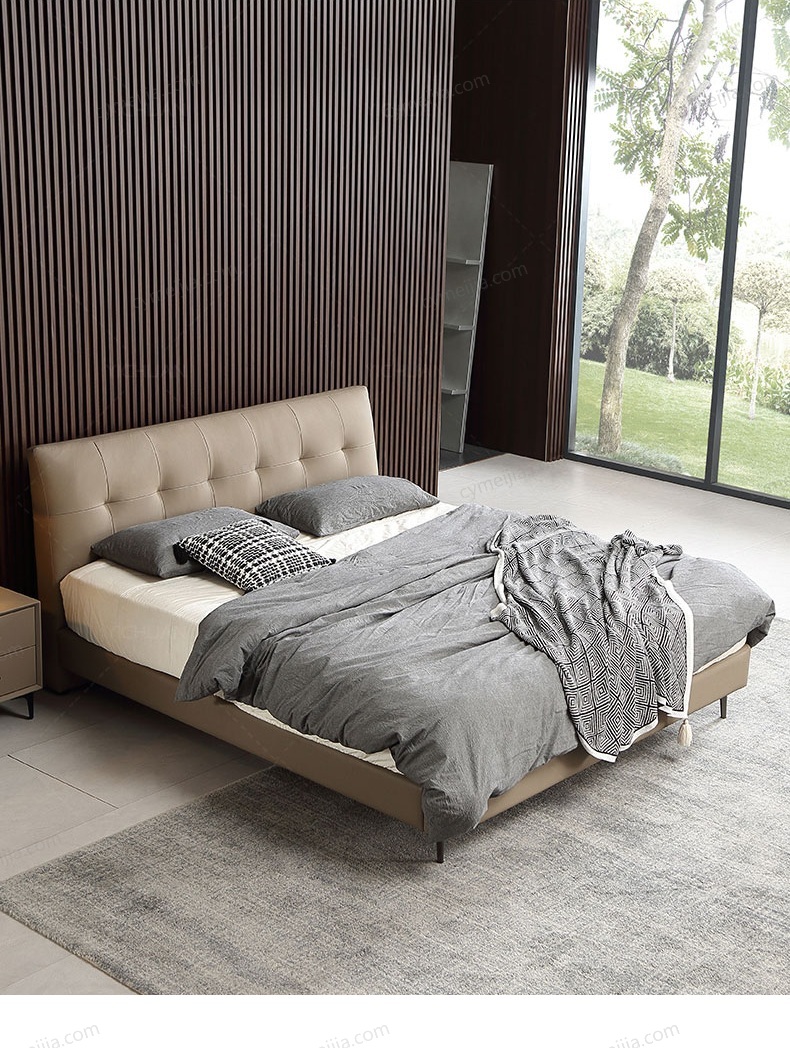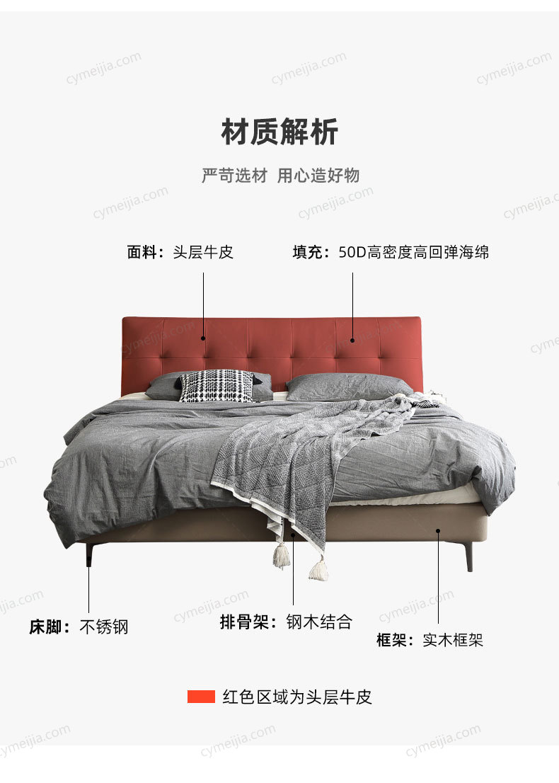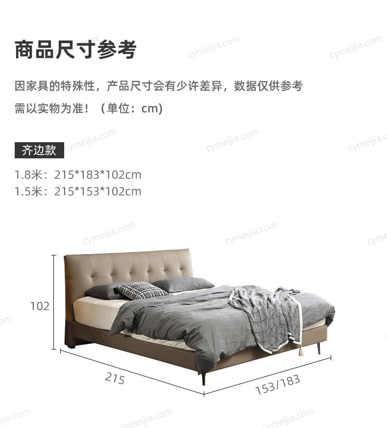 | 产品材质 : | 接触面头层牛皮+实木床边+黑色角码+10公分松木排骨架 |