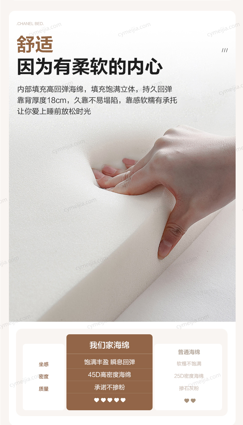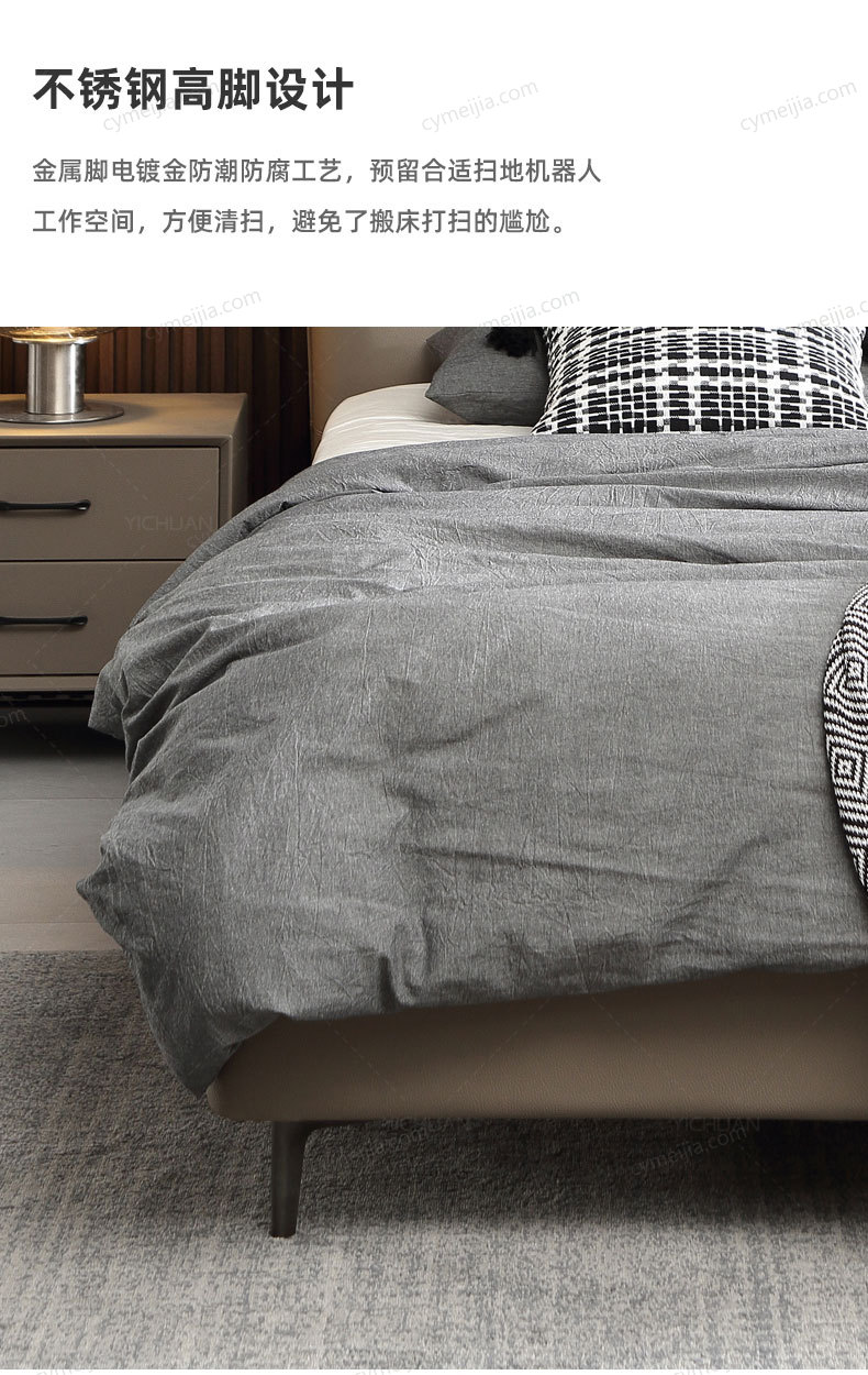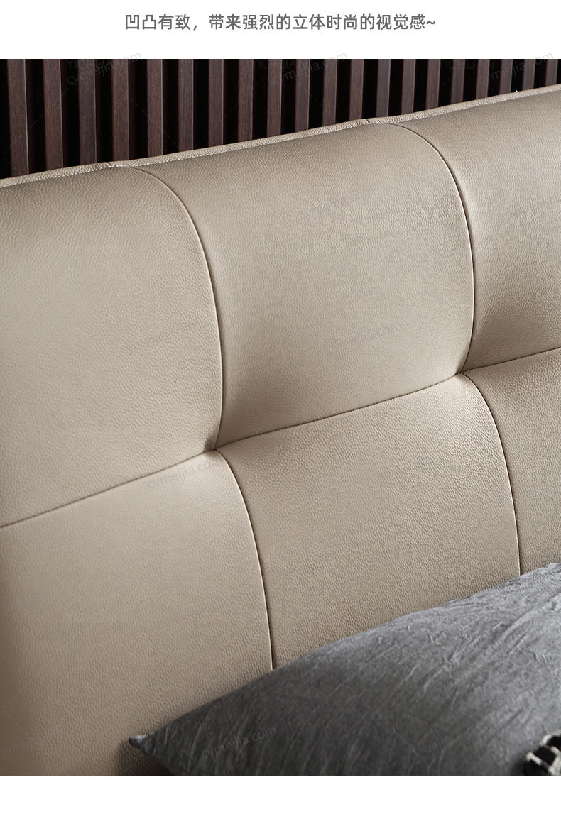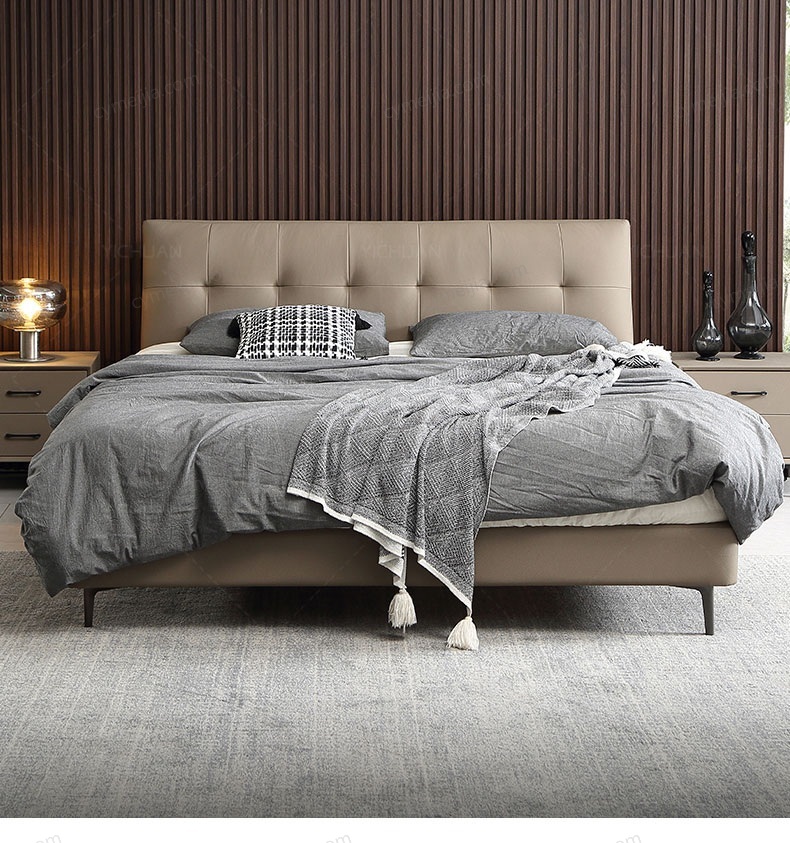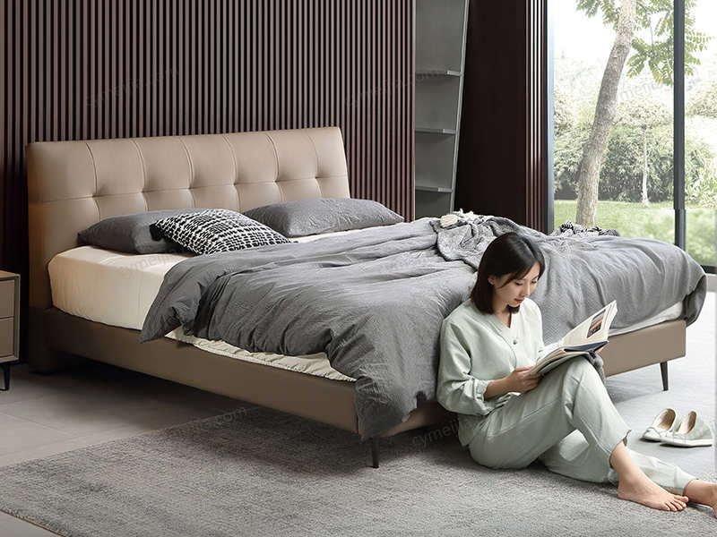 | 产品材质 : | 接触面头层牛皮+实木床边+黑色角码+10公分松木排骨架 |