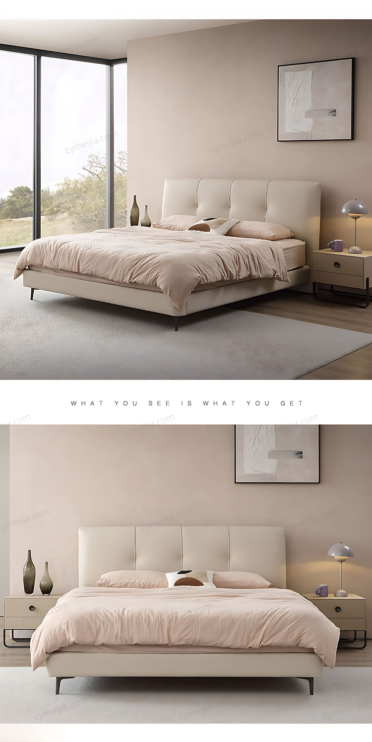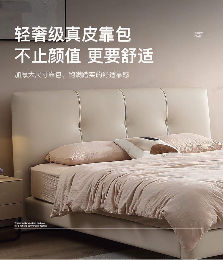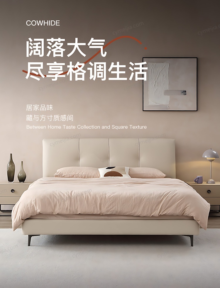 | 产品材质 : | 接触面头层牛皮+实木床边+黑色角码+10公分松木排骨架 |