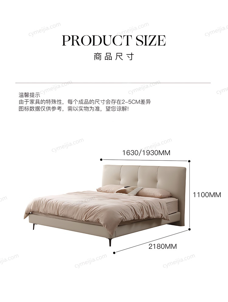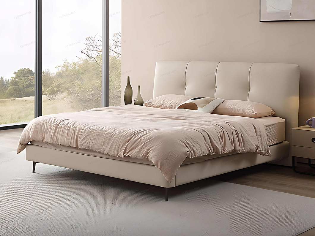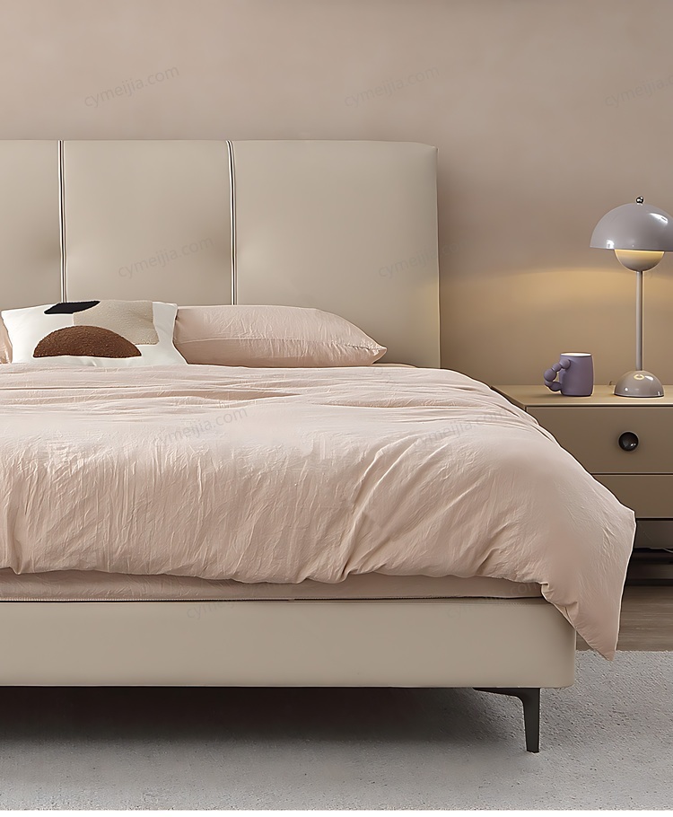以极简方块拉扣床头塑造高级立体感,搭配细腻亲肤的头层牛皮,触感与视觉的双重奢享瞬间拉满卧室格调。金属床脚设计,让床体在简约中透着轻盈,适配现代、轻奢等多元家居风格。