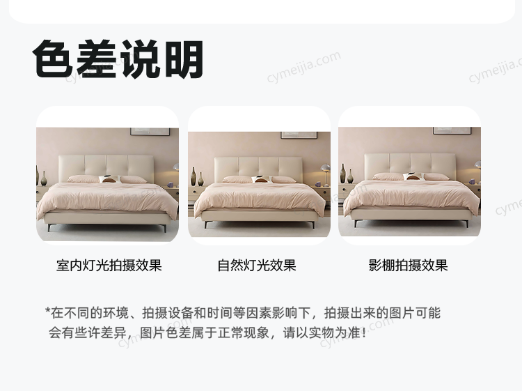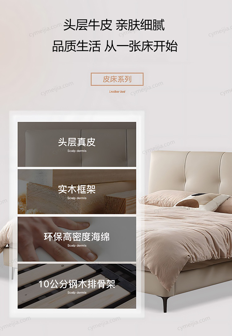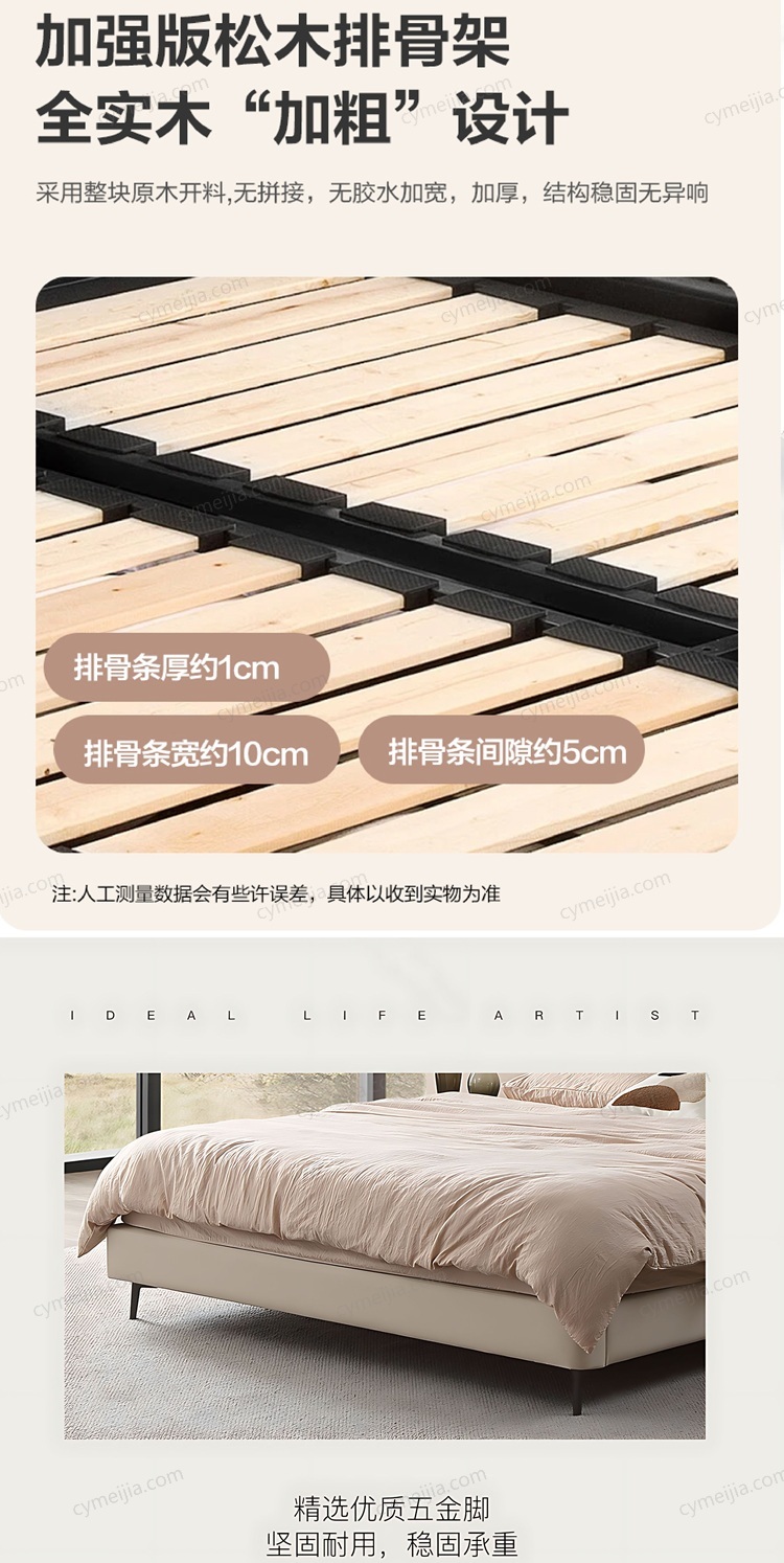 | 产品材质 : | 接触面头层牛皮+实木床边+黑色角码+10公分松木排骨架 |