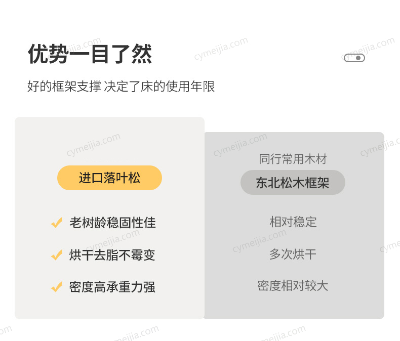 ◕ 高定级全实木框架,进口俄罗斯落叶松精方,木方2*4cm,比市面同行厚1-2cm,更加稳固支撑,耐用承托。