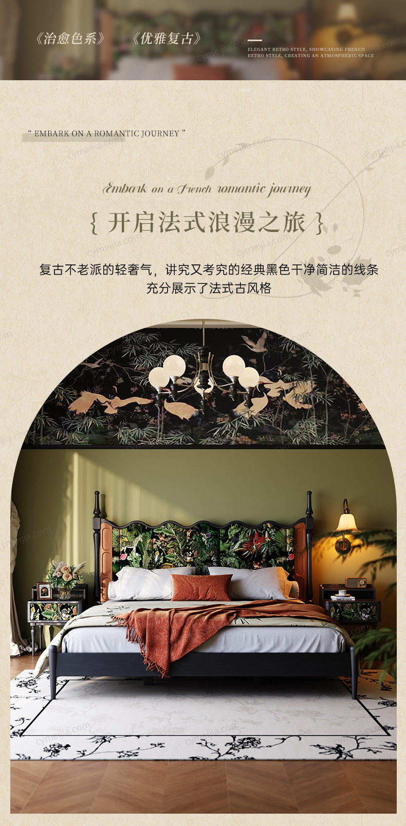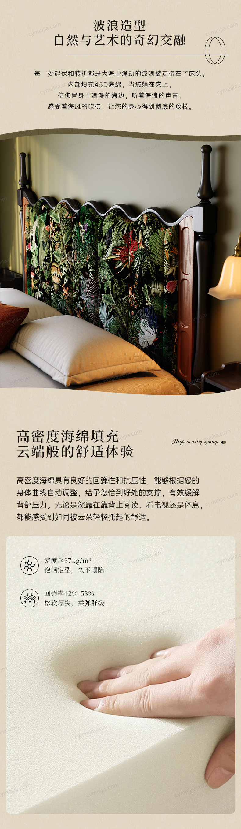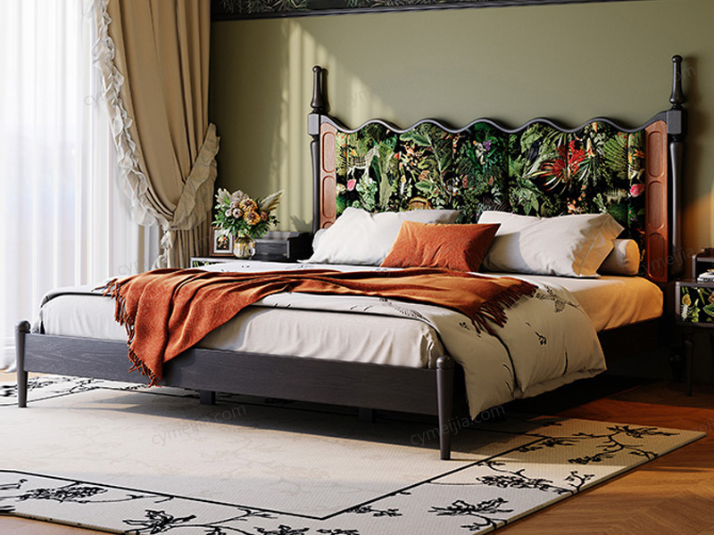 ☀ 波浪型高靠背设计,以自然海浪为灵感,勾勒出灵动优雅的曲线,整体营造出兼具自然诗意与复古格调的卧室氛围。