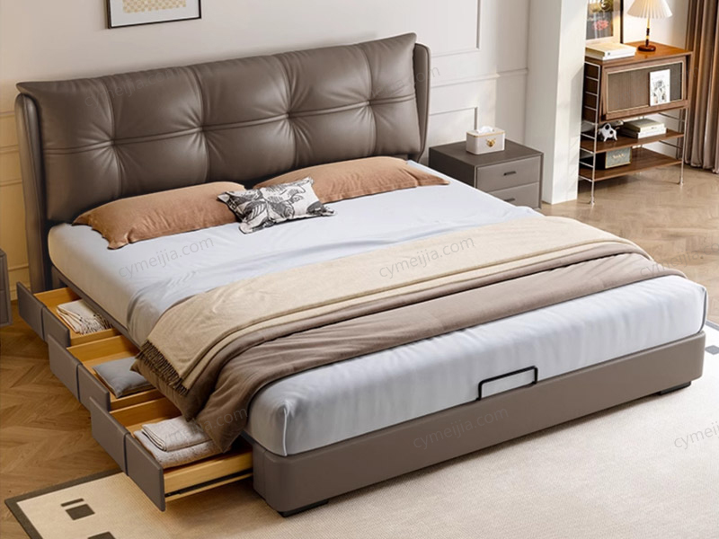 ✿ 全实木抽屉,不使用密度板或颗粒板,承重力强,更环保耐用;抽屉面板包裹优质仿皮,与床体风格统一且质感高级;搭配优质五金滑轨 + 阻尼设计,推拉顺畅无噪音,且安全防夹伤,日常使用更安心。