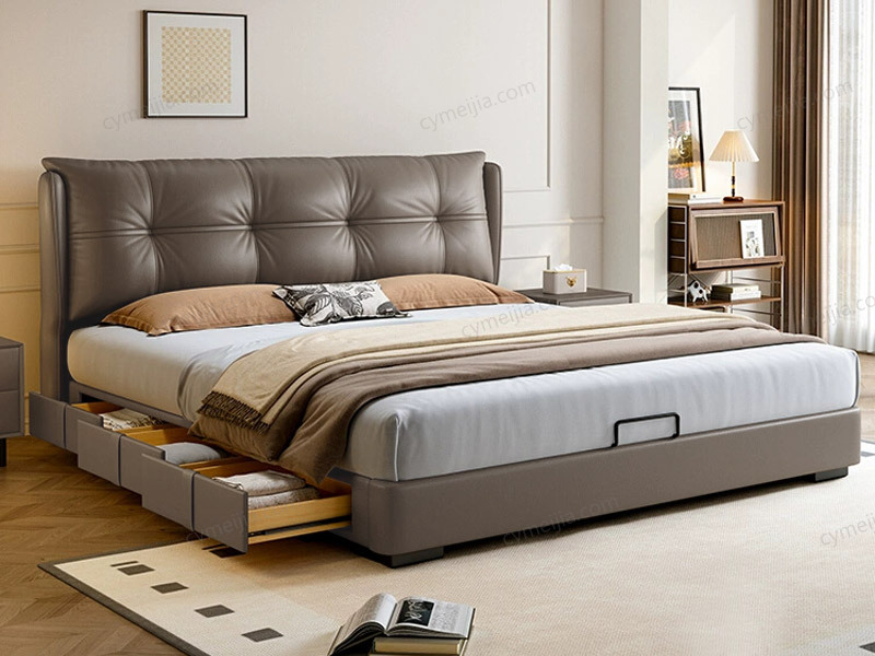 ✿ 全实木抽屉,不使用密度板或颗粒板,承重力强,更环保耐用;抽屉面板包裹优质仿皮,与床体风格统一且质感高级;搭配优质五金滑轨 + 阻尼设计,推拉顺畅无噪音,且安全防夹伤,日常使用更安心。