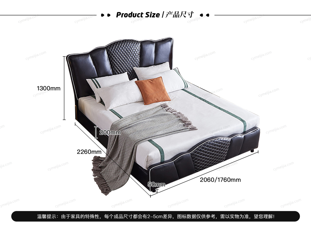 | 产品材质 : | 头层黄牛皮(接触面)+仿真皮(非接触面)+实木(床侧)+10公分松木排骨架 |