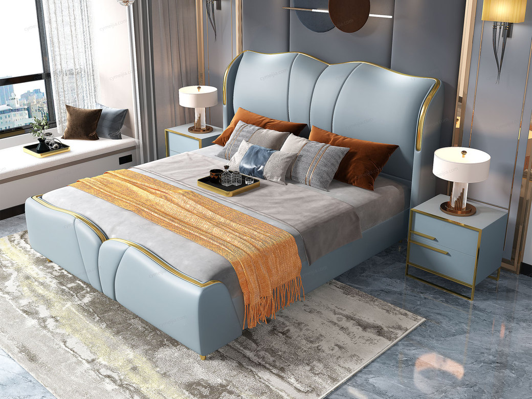 | 产品材质 : | 头层黄牛皮(接触面)+仿真皮(非接触面)+实木(床侧)+10公分松木排骨架 |