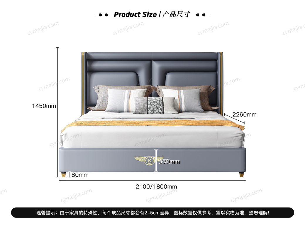 | 产品材质 : | 头层黄牛皮(接触面)+仿真皮(非接触面)+实木(床侧)+10公分松木排骨架 |