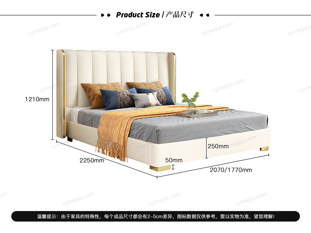 | 产品材质 : | 头层黄牛皮(接触面)+仿真皮(非接触面)+实木(床侧)+10公分松木排骨架 |