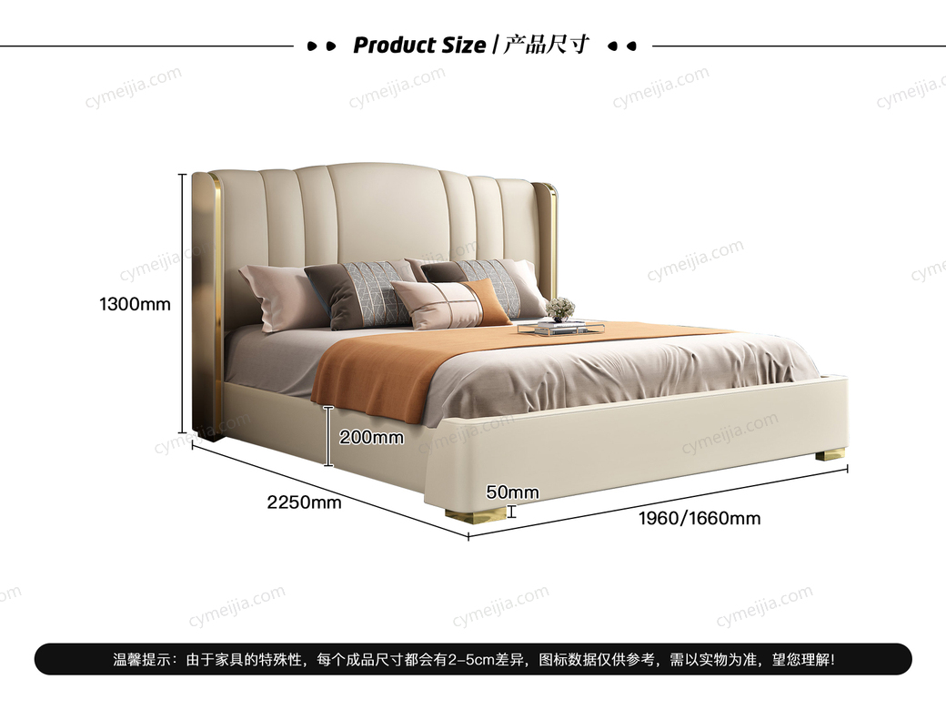 | 产品材质 : | 头层黄牛皮(接触面)+仿真皮(非接触面)+实木(床侧)+10公分松木排骨架 |