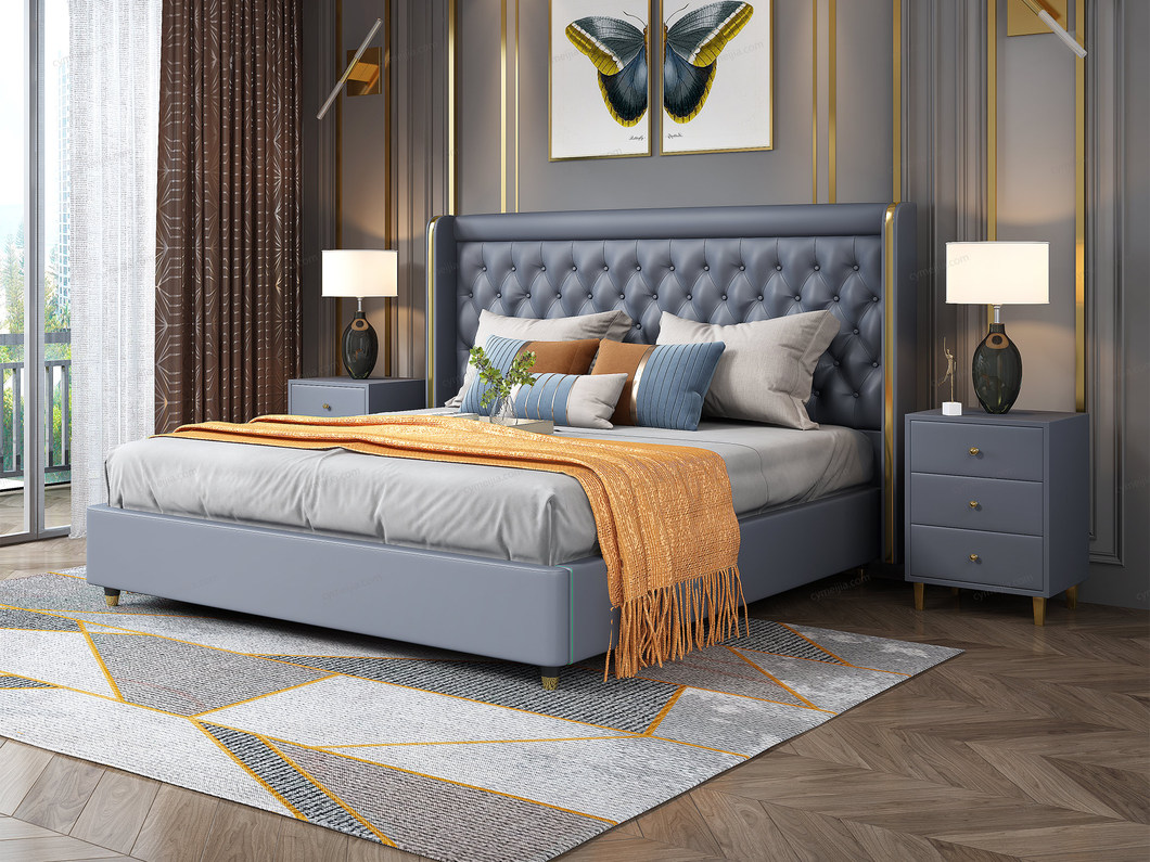 | 产品材质 : | 头层黄牛皮(接触面)+仿真皮(非接触面)+实木(床侧)+10公分松木排骨架 |