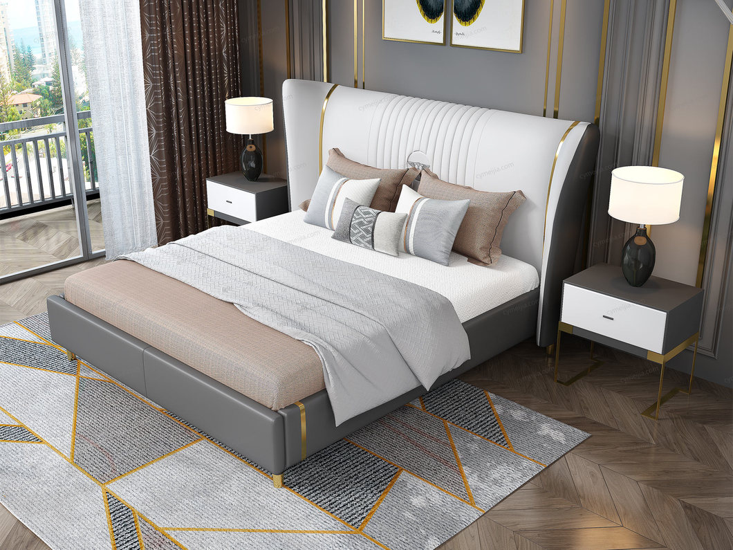 | 产品材质 : | 头层黄牛皮(接触面)+仿真皮(非接触面)+实木(床侧)+10公分松木排骨架 |