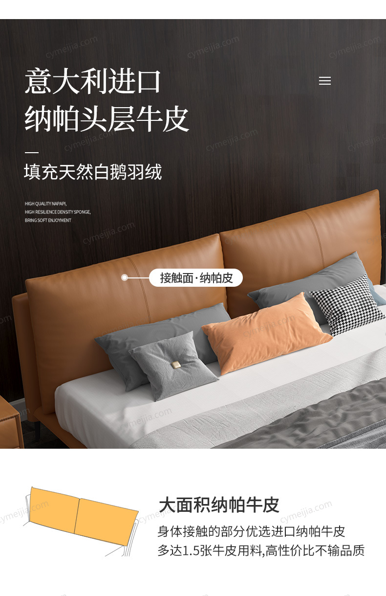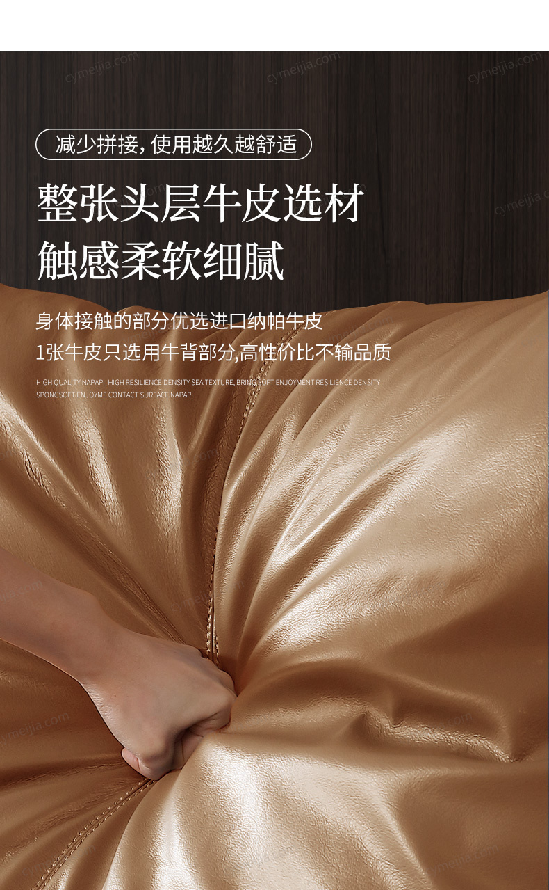 | 产品材质 : | 接触面进口头层黄牛皮+高密度海棉+鹅绒靠包+俄罗斯落叶松实木框架+碳素钢脚+10公分松木排骨架 |