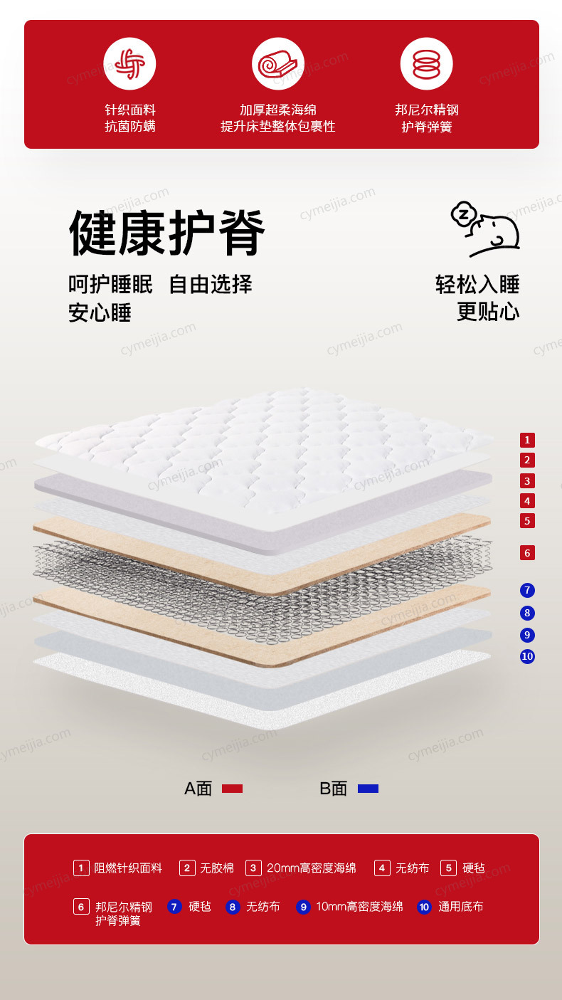 | 产品材质 : | 邦尼尔精钢护脊弹簧+阻燃面料+高密度超柔海绵+人造纤维无纺布 |