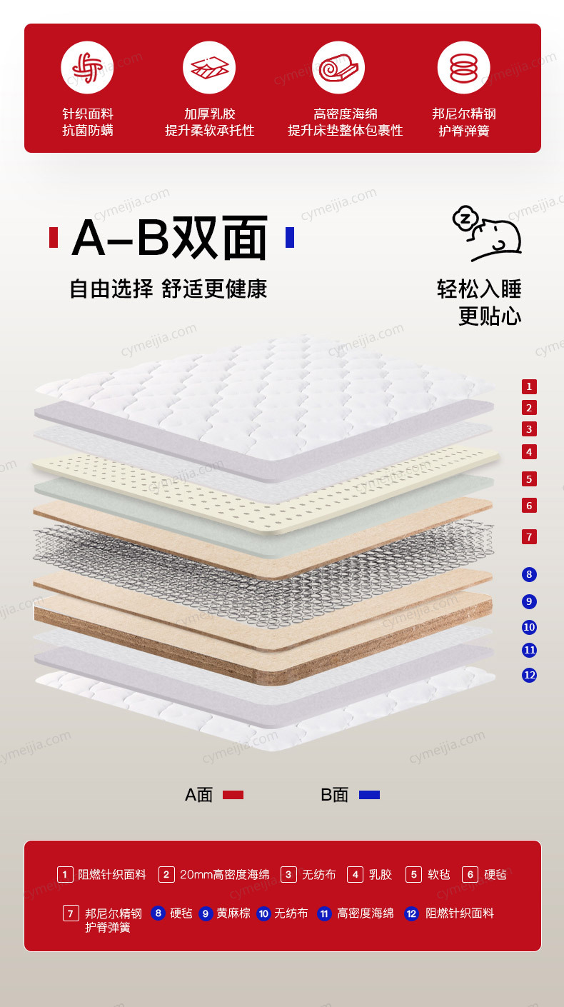 | 产品材质 : | 天然乳胶+天然进口黄麻棕+邦尼尔精钢护脊弹簧+阻燃面料+高密度超柔海绵+人造纤维无纺布 |