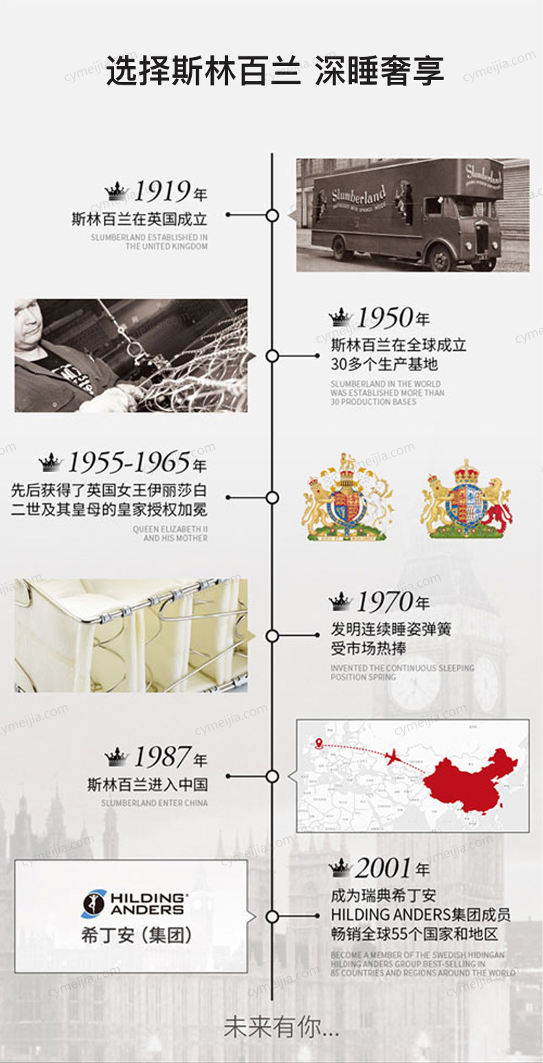 瑞典-希丁安集团旗下品牌,创立于1939年,是欧洲第一全球最大的床具制造集团之一,在世界二十多个国家拥有超过三十家工厂和7千名员工,年营业额超过11亿欧元。斯林百兰成功继承了英国血统,2014年在中国优雅升级,之后在法国重新上市