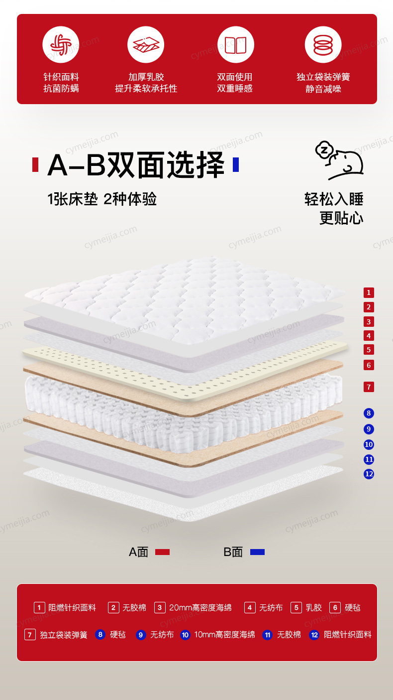 | 产品材质 : | 天然乳胶+独立袋装弹簧+阻燃面料+高密度超柔海绵+人造纤维无纺布 |