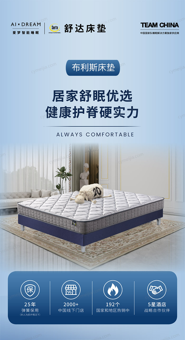 舒达(Serta)床垫,诞生于1931年,是一个全球性专业的健康睡眠品牌,畅销全球约190个国家和地区,92年来始终致力于为全球消费者提供优质健康的睡眠服务,让每个人都能“夜夜好眠”是舒达的愿景。舒达自1998年进入中国以来,坚持并一贯秉承“制造世界上最好的床垫”为使命