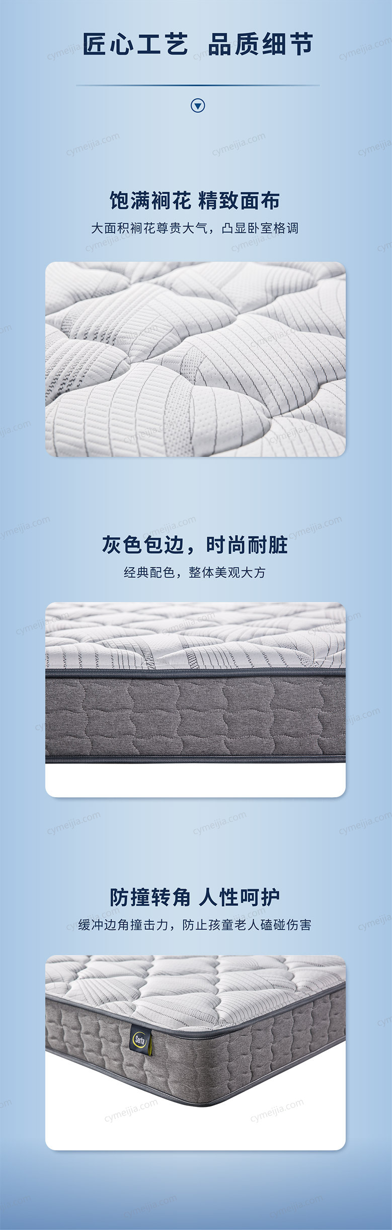 | 产品材质 : | 抗菌阻螨针织面料+邦尼尔弹簧+舒柔海绵+优质棉纤维+单面免翻设计 |