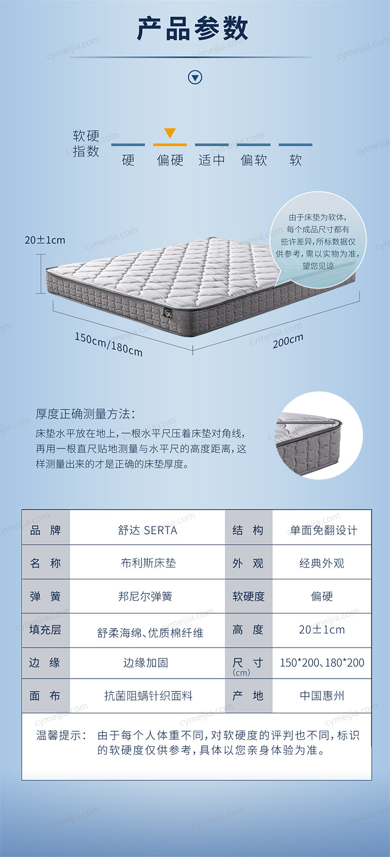 | 品牌 : Serta舒达床垫 | 型号 : SD-BLS-1800-2000-200-CD | 单双面使用 : 单面使用 | |
