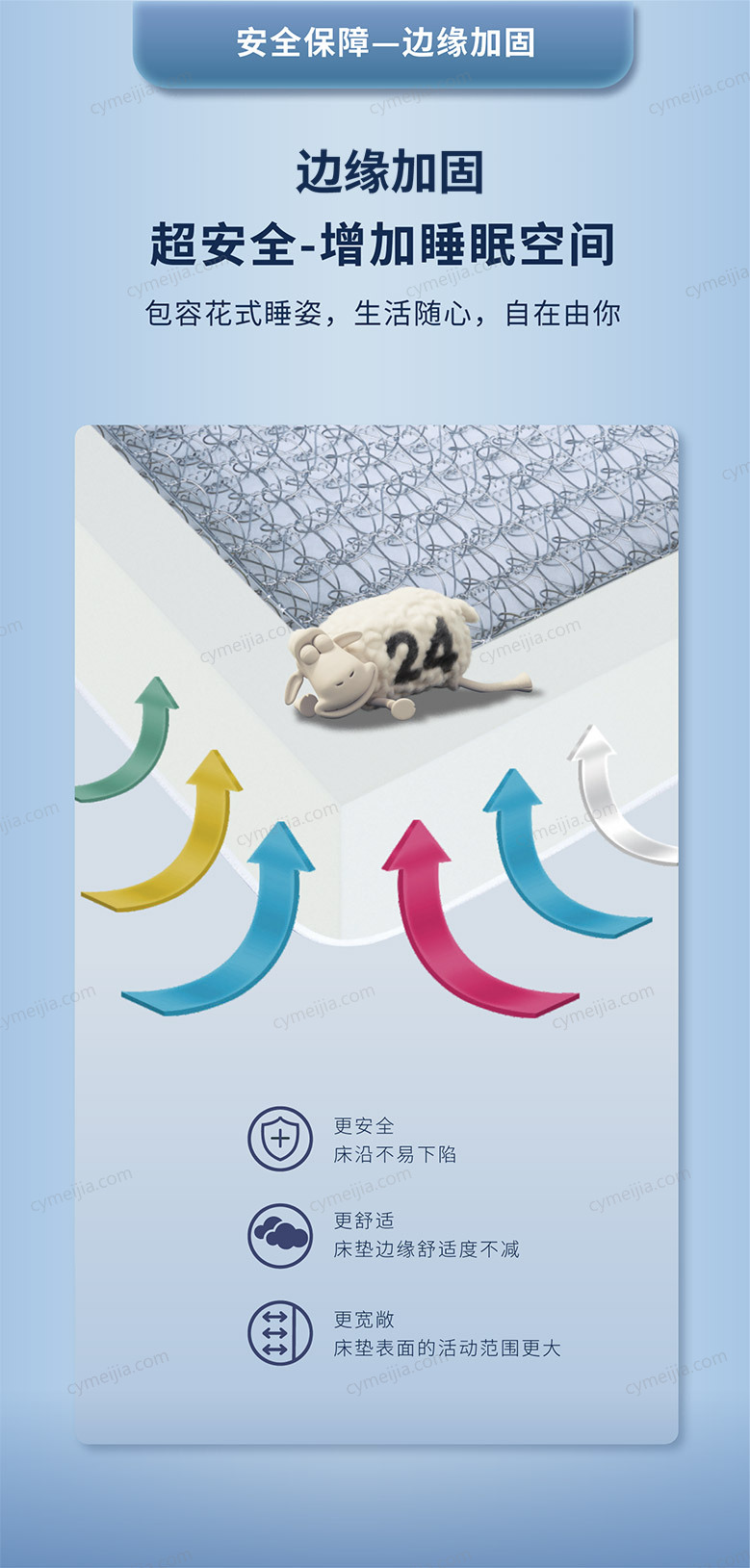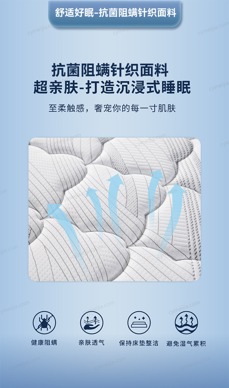 | 产品材质 : | 抗菌阻螨针织面料+邦尼尔弹簧+舒柔海绵+优质棉纤维+单面免翻设计 |