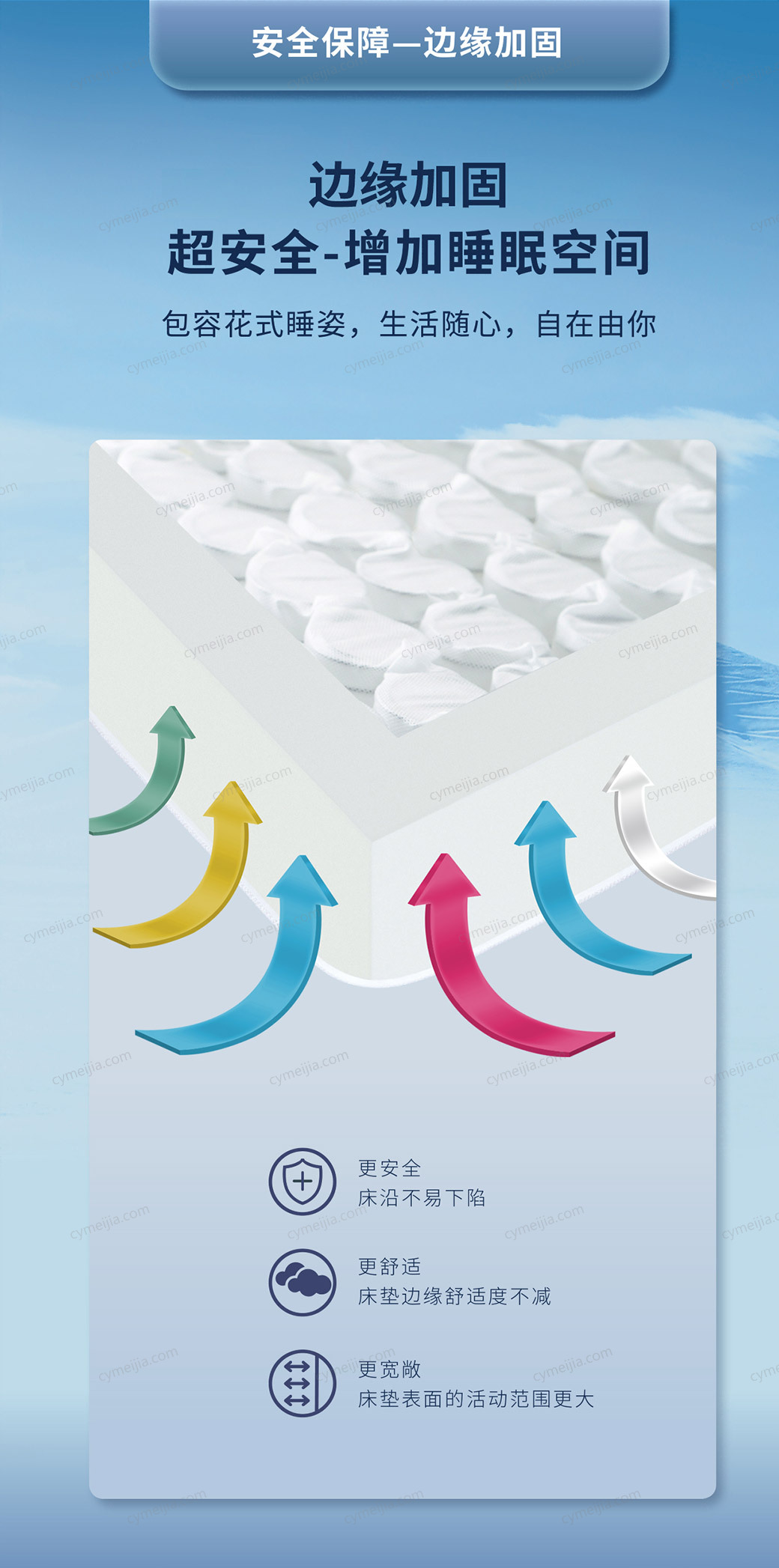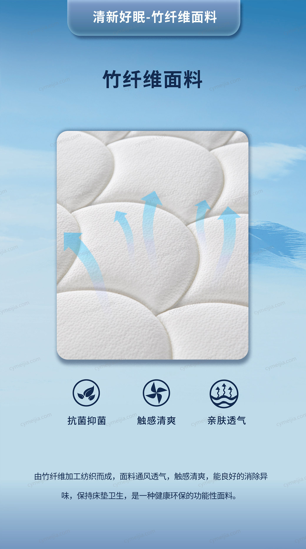 | 产品材质 : | 竹纤维面料+舒柔绗缝层+波浪海绵+舒柔海绵+优质棉纤维+独立袋装弹簧+单面免翻设计+边缘加固 |