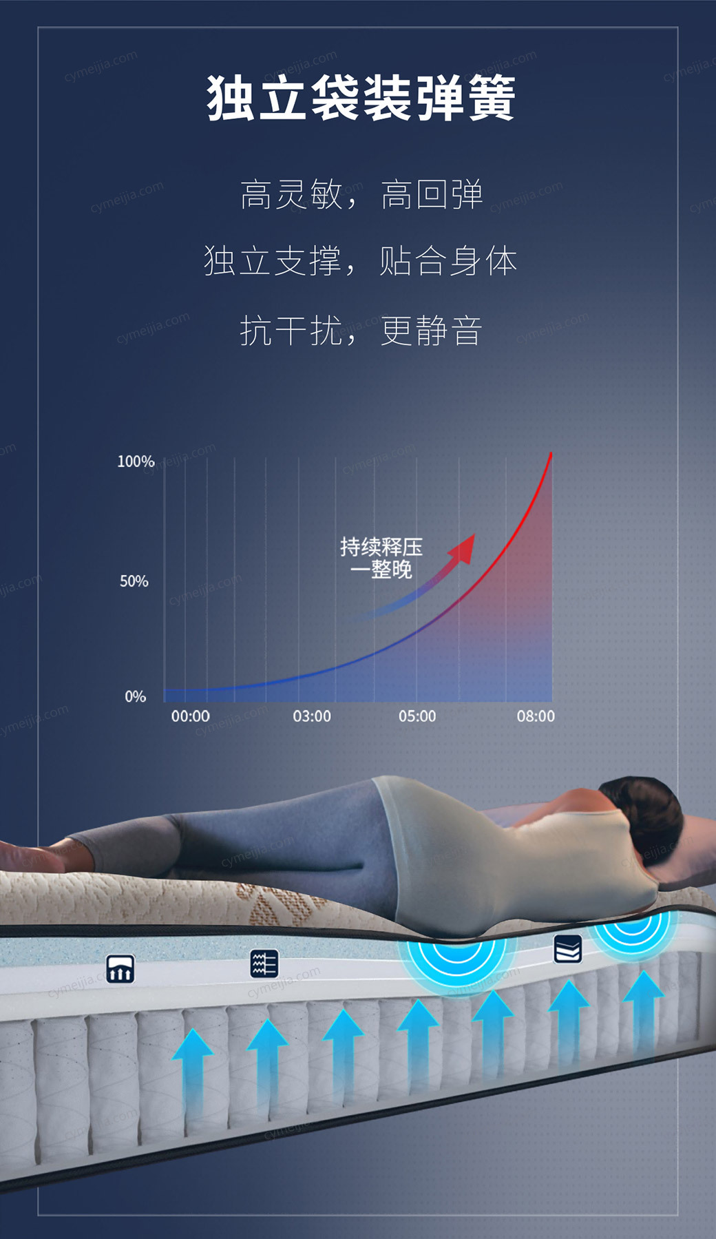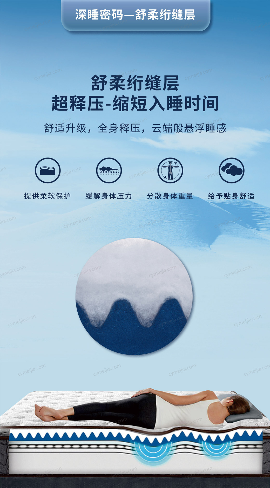 | 产品材质 : | 竹纤维面料+舒柔绗缝层+波浪海绵+舒柔海绵+优质棉纤维+独立袋装弹簧+单面免翻设计+边缘加固 |