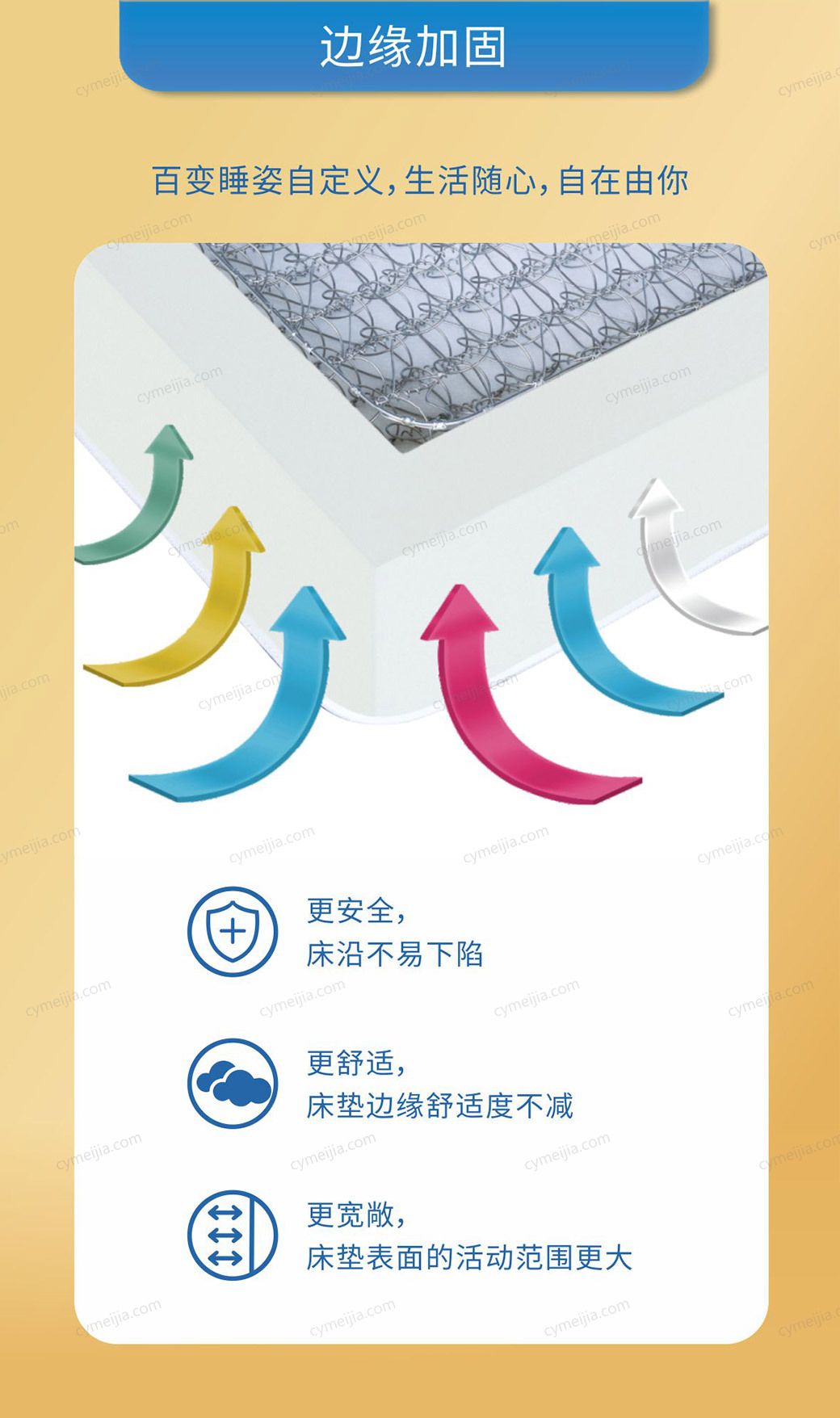 | 产品材质 : | 负氧离子针织面料+有机棉面料+舒柔海绵+双重V-C-P护脊系统+优质棉纤维+邦尼尔弹簧+双面睡感设计+边缘加固 |
