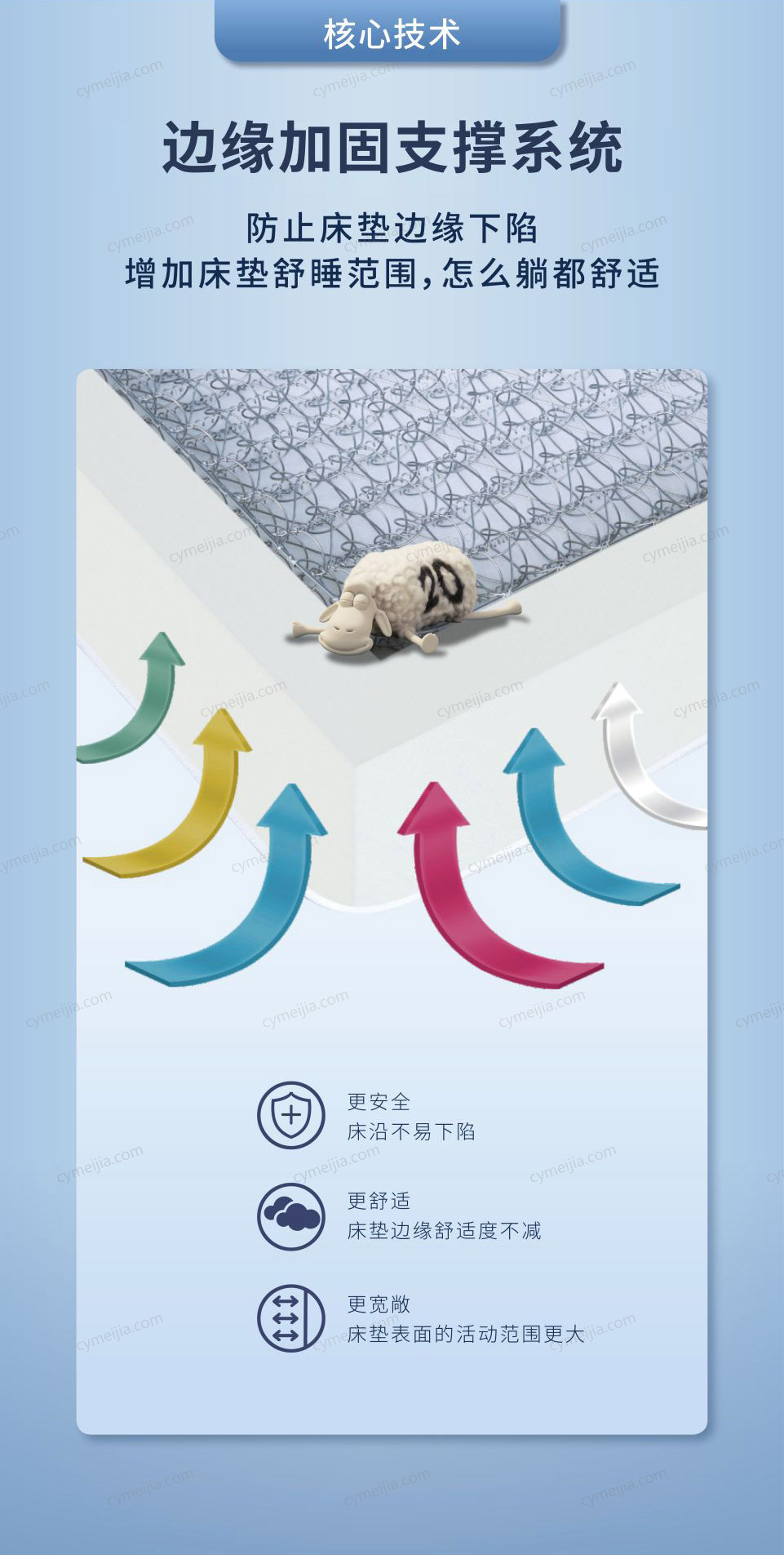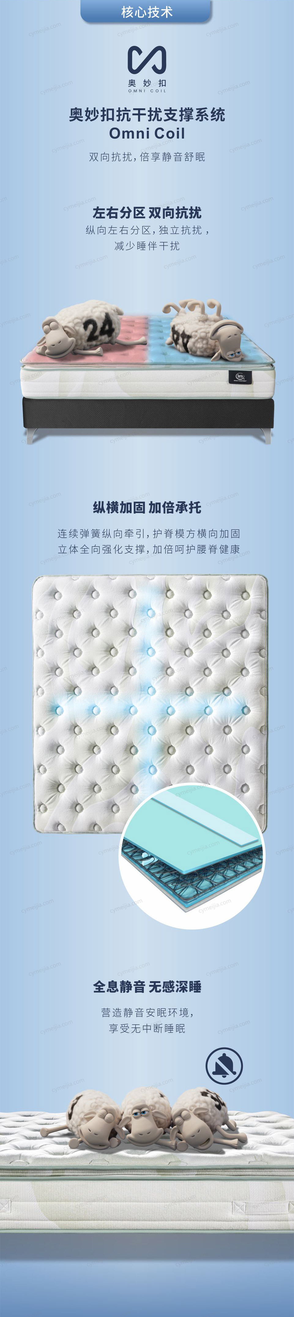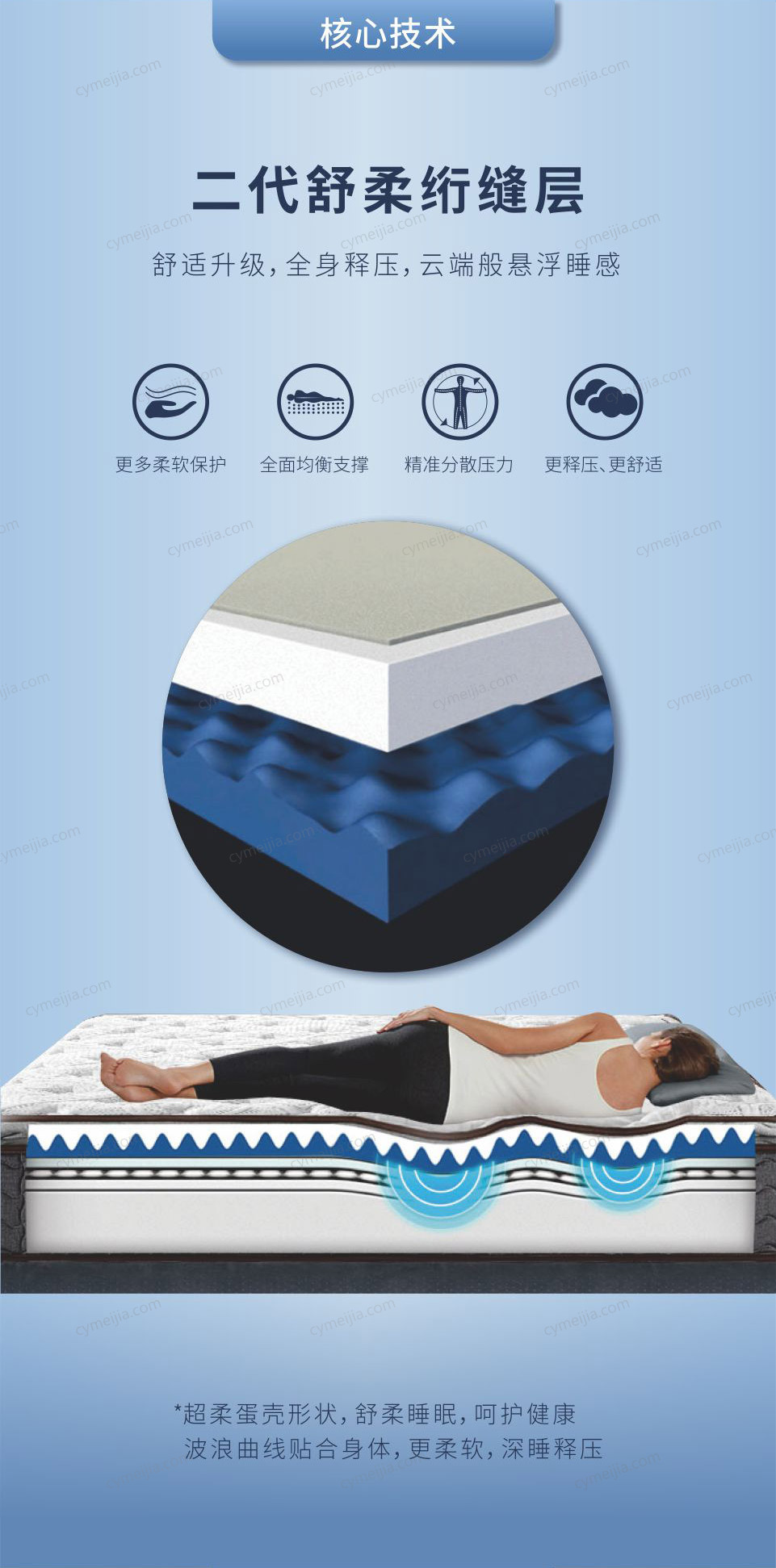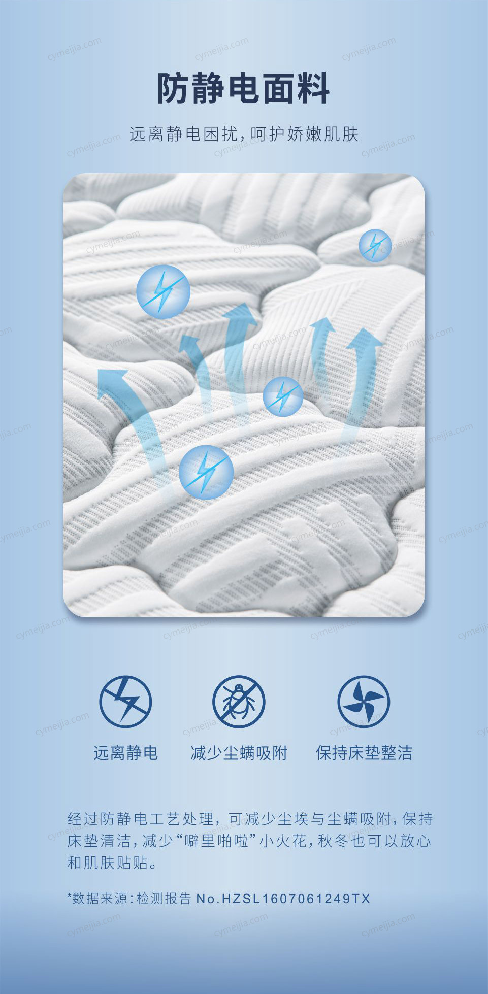 | 产品材质 : | 防静电面料+新型柔软纤维+二代舒柔绗缝层+乳胶+舒柔海绵+优质棉纤维+奥妙扣抗干扰支撑系统+舒适减压层设计+边缘加固支撑系统 |