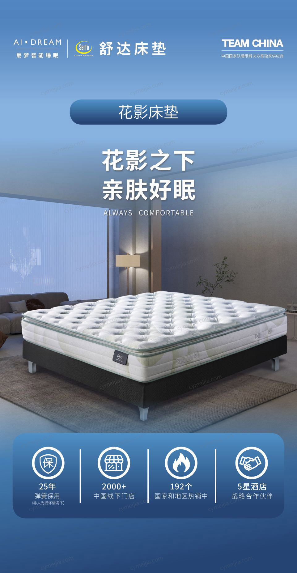 舒达(Serta)床垫,诞生于1931年,是一个全球性专业的健康睡眠品牌,畅销全球约190个国家和地区,92年来始终致力于为全球消费者提供优质健康的睡眠服务,让每个人都能“夜夜好眠”是舒达的愿景。舒达自1998年进入中国以来,坚持并一贯秉承“制造世界上最好的床垫”为使命
