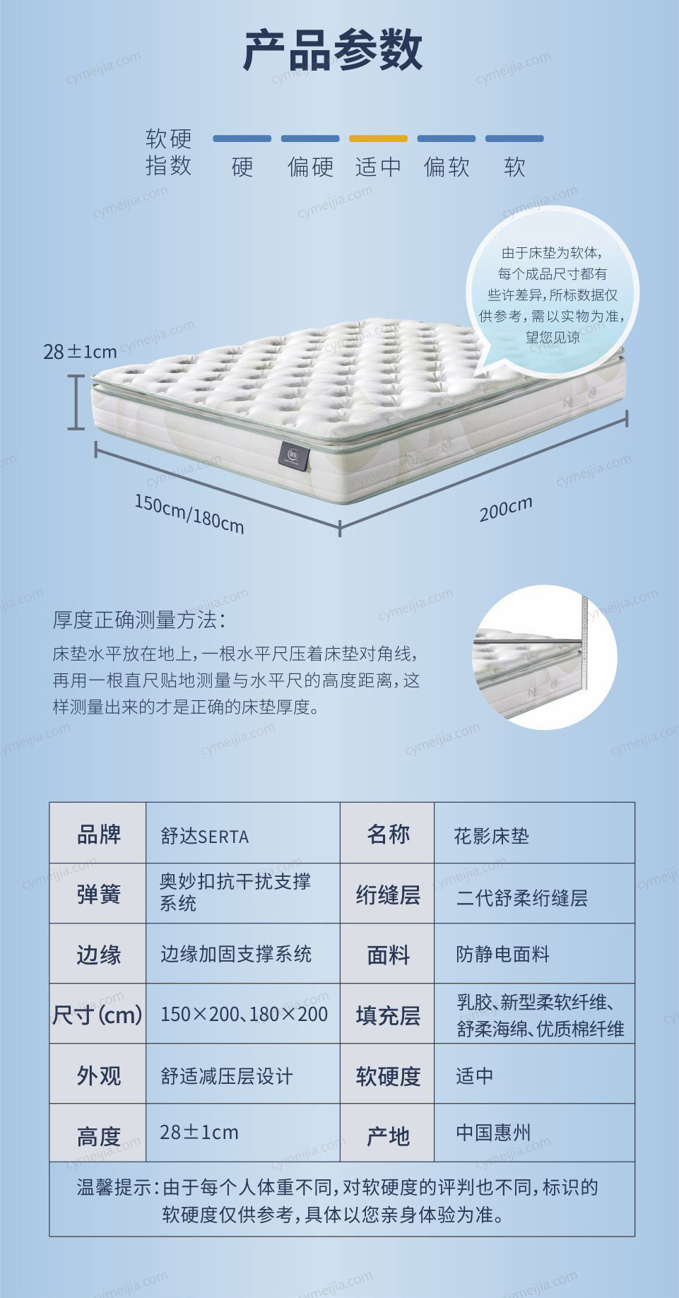 | 品牌 : Serta舒达床垫 | 型号 : SD-HY-1500-2000-280-CD | 单双面使用 : 单面使用 | |